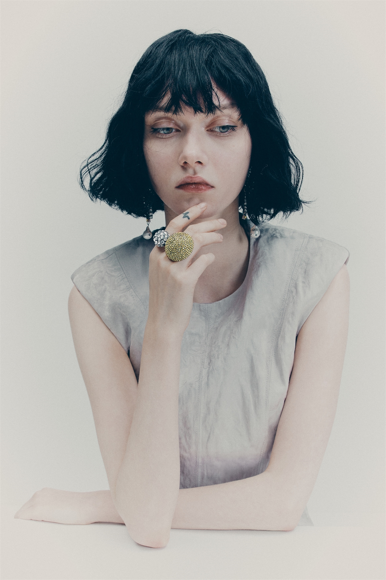 Кольцо из металла с потертой отделкой. Верхняя часть куполообразной формы инкрустирована сверкающими стеклянными стразами разных цветов и размеров.