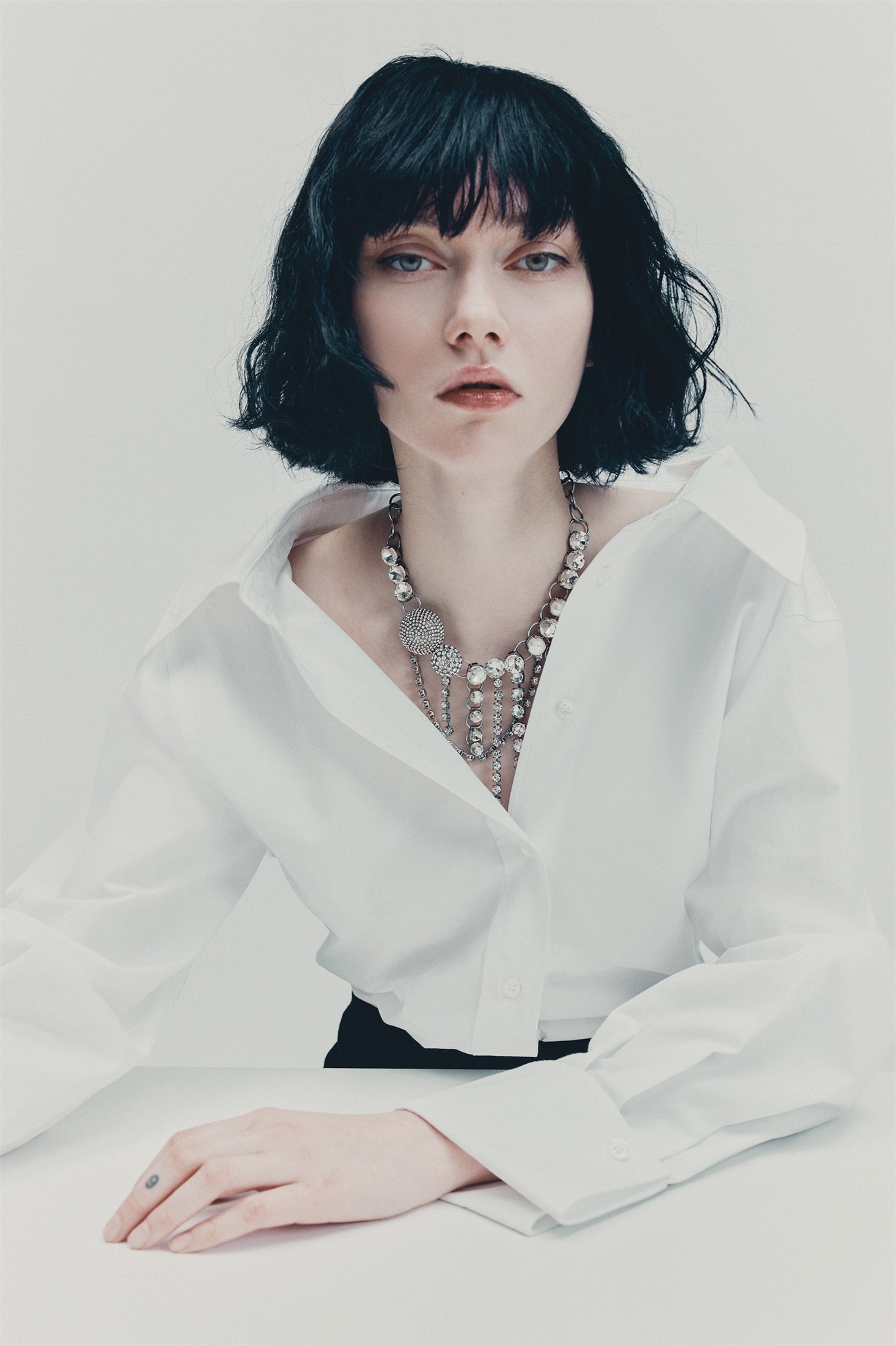 Ожерелье на короткой цепочке из круглых звеньев с многослойным расположением сверкающих стеклянных стразов и блестящих перламутровых бусин, которые изящно драпируются по линии шеи. Регулируемая длина с застежкой-триггером.