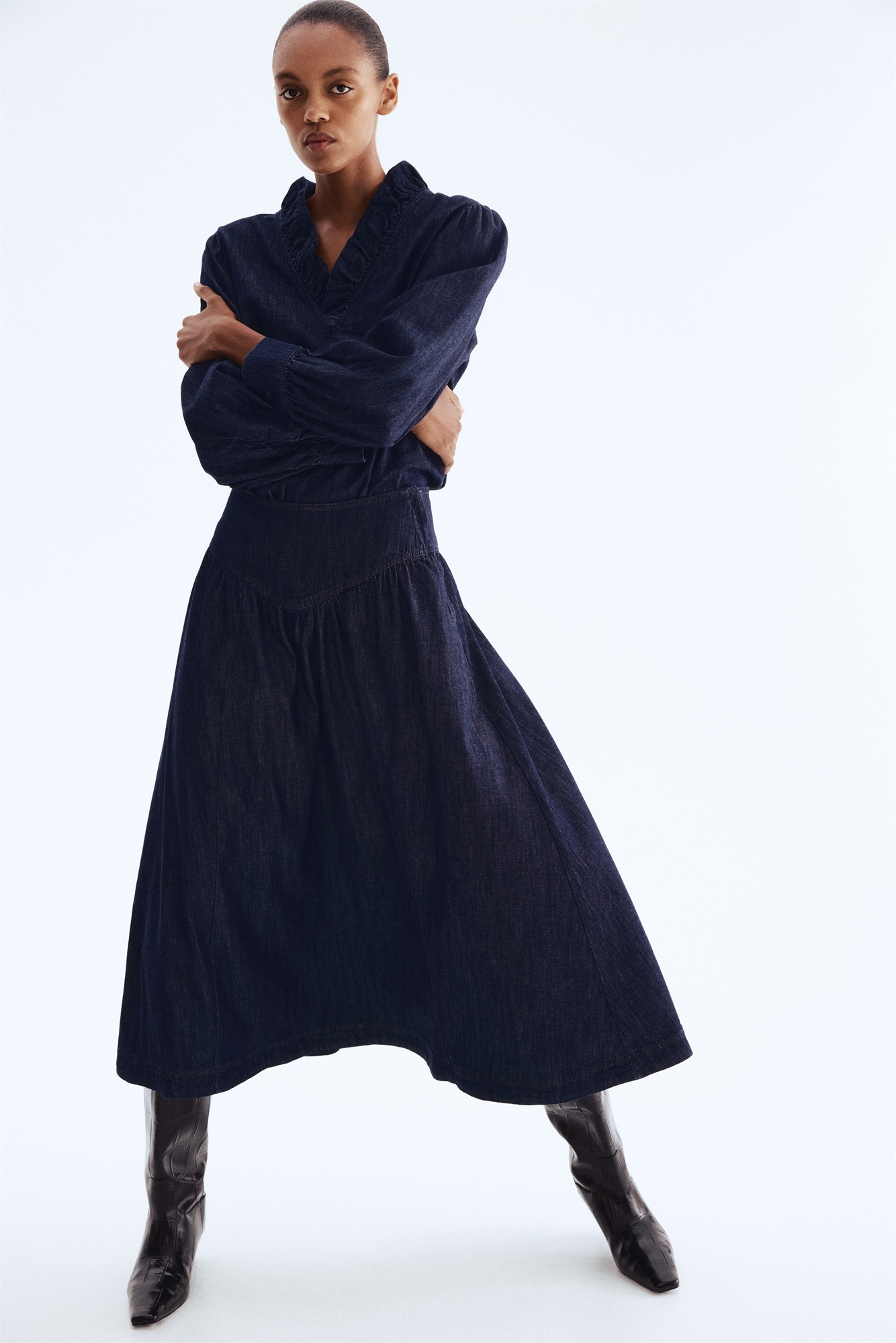 Юбка длиной до колена из хлопкового денима с высокой талией, потайной застежкой-молнией с одной стороны и сборкой по шву на бедрах для создания расклешенного силуэта.