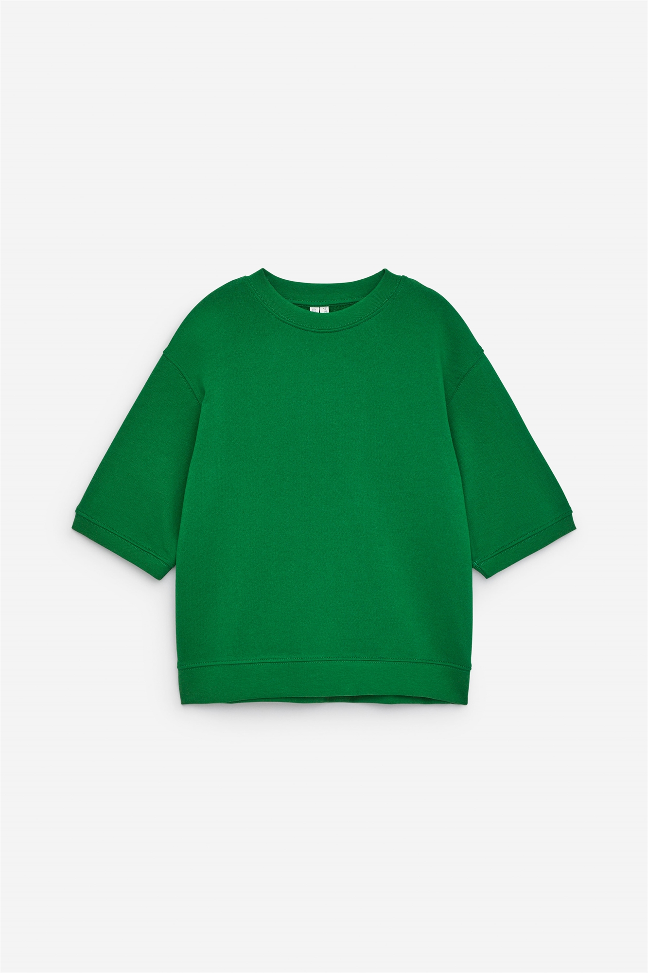 Толстовка с короткими рукавами сшита из хлопка. Модель с вырезом для экипажа и непринужденным кроем.