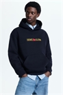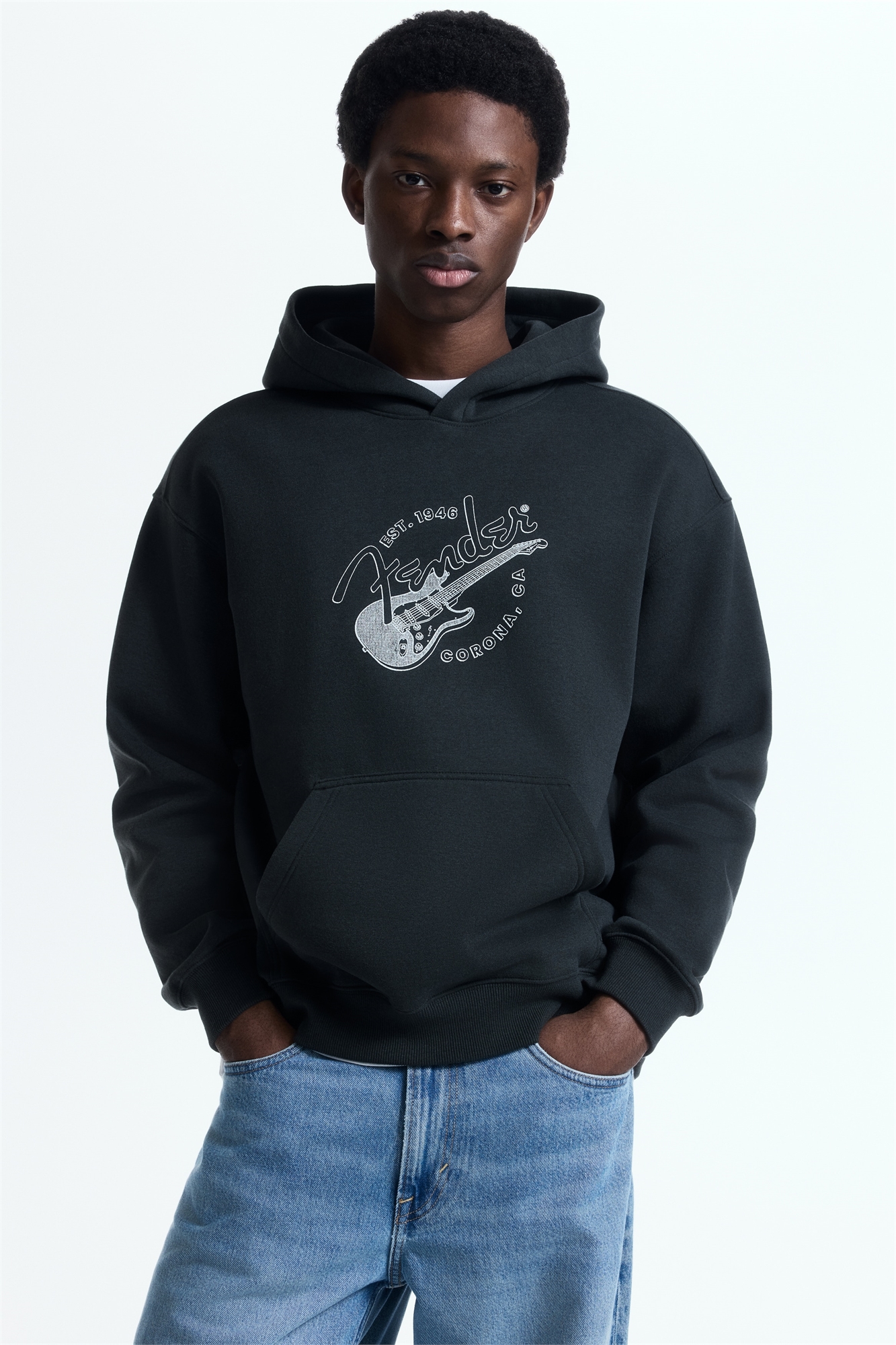Толстовка с капюшоном из принтованной ткани с мягким начесом внутри. Капюшон на подкладке, завязки спереди, спущенные плечи, карман-кенгуру, манжеты и подол в рубчик. Свободный крой для пышного, но не слишком большого силуэта.