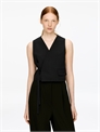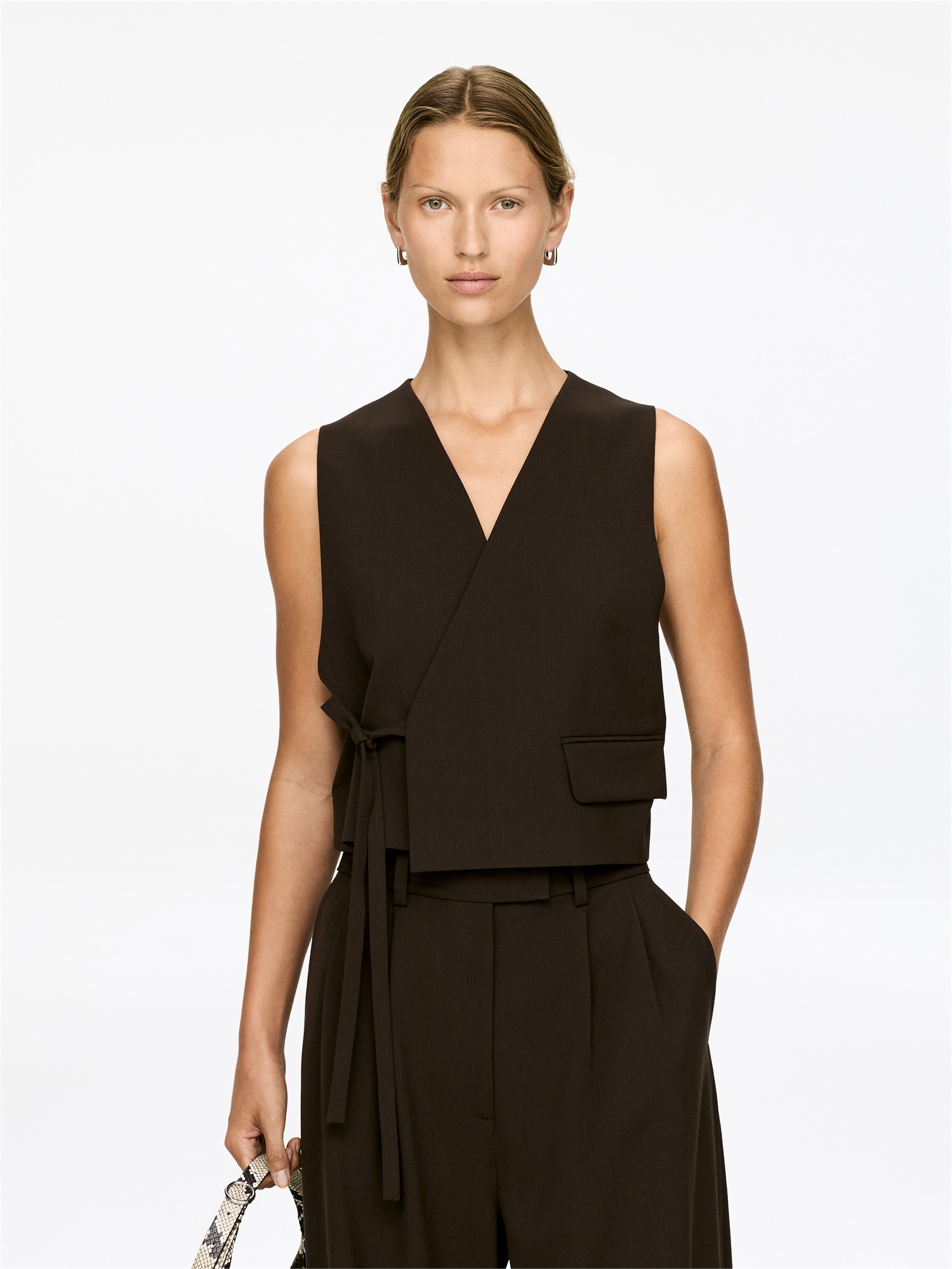 Приталенный жилет с накладным передом, завязывающимся ремешком и внутренней пуговицей, с декоративным клапаном кармана. Ткань оболочки содержит 43% шерсти RWS (TE-00047206). Продукция, сертифицированная по стандарту ответственной шерсти (RWS), содержит шерстяное волокно с ферм, прошедших независимую сертификацию на соответствие требованиям по благополучию животных и землепользованию.