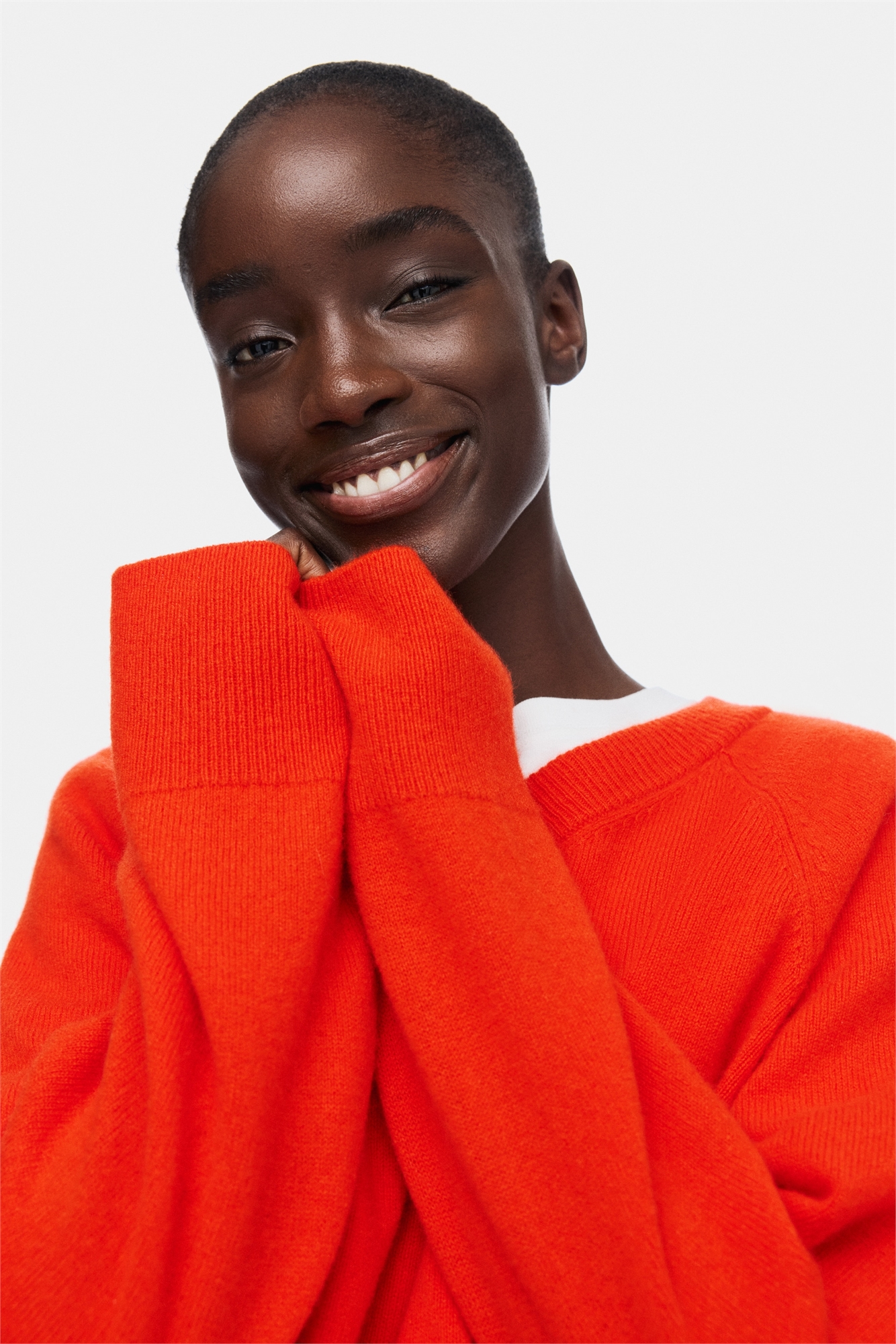 Джемпер оверсайз из мягкой вязаной шерсти с V-образным вырезом в рубчик и длинными рукавами реглан. Ребра на манжетах и подоле.