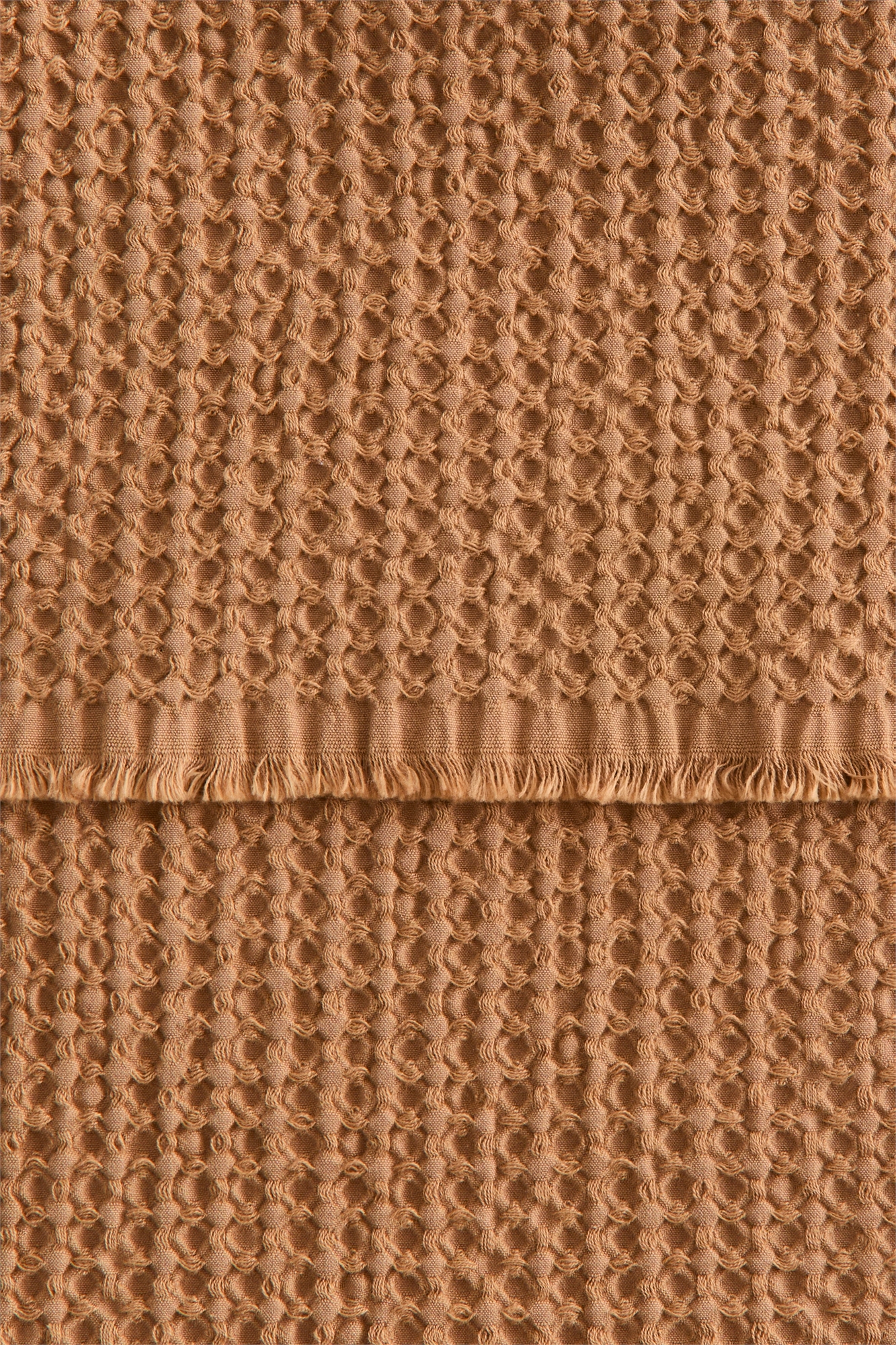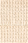 Гостевое полотенце из мягкого хлопка с вафельной текстурой, с бахромой по нижнему краю и петлей для подвешивания по верхнему краю.