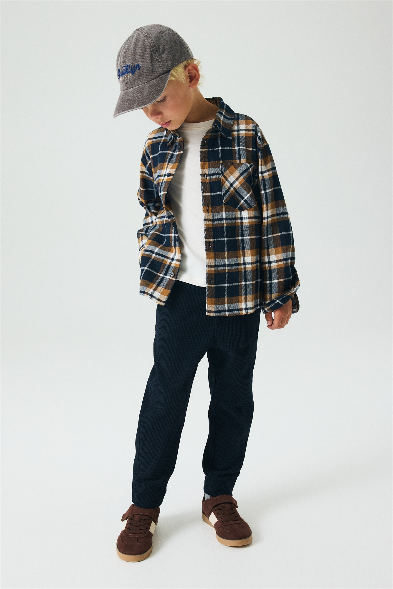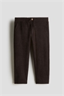 Брюки из мягкого ребристого велюра со свободной посадкой по бедрам и ляжкам. Эластичный пояс с утяжкой, фальшивая ширинка с пуговицей и диагональные боковые карманы.
