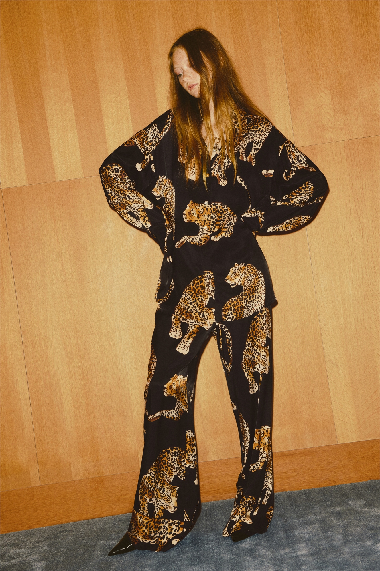 Свободные брюки из мягко драпирующегося вискозного атласа. Высокая талия с эластичной отделкой и узким шнурком, широкие ноги с узкой отделкой по подолу.