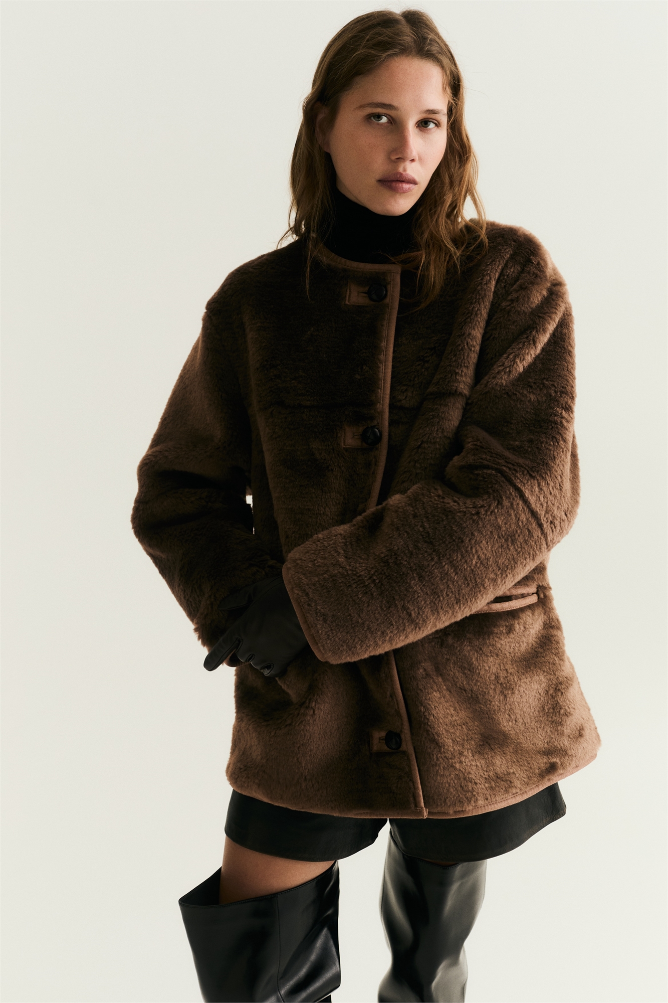 Жакет из мягкой пушистой ткани с переплетами из мелованной ткани. Круглый вырез, пуговицы спереди и втачные передние карманы. На подкладке.