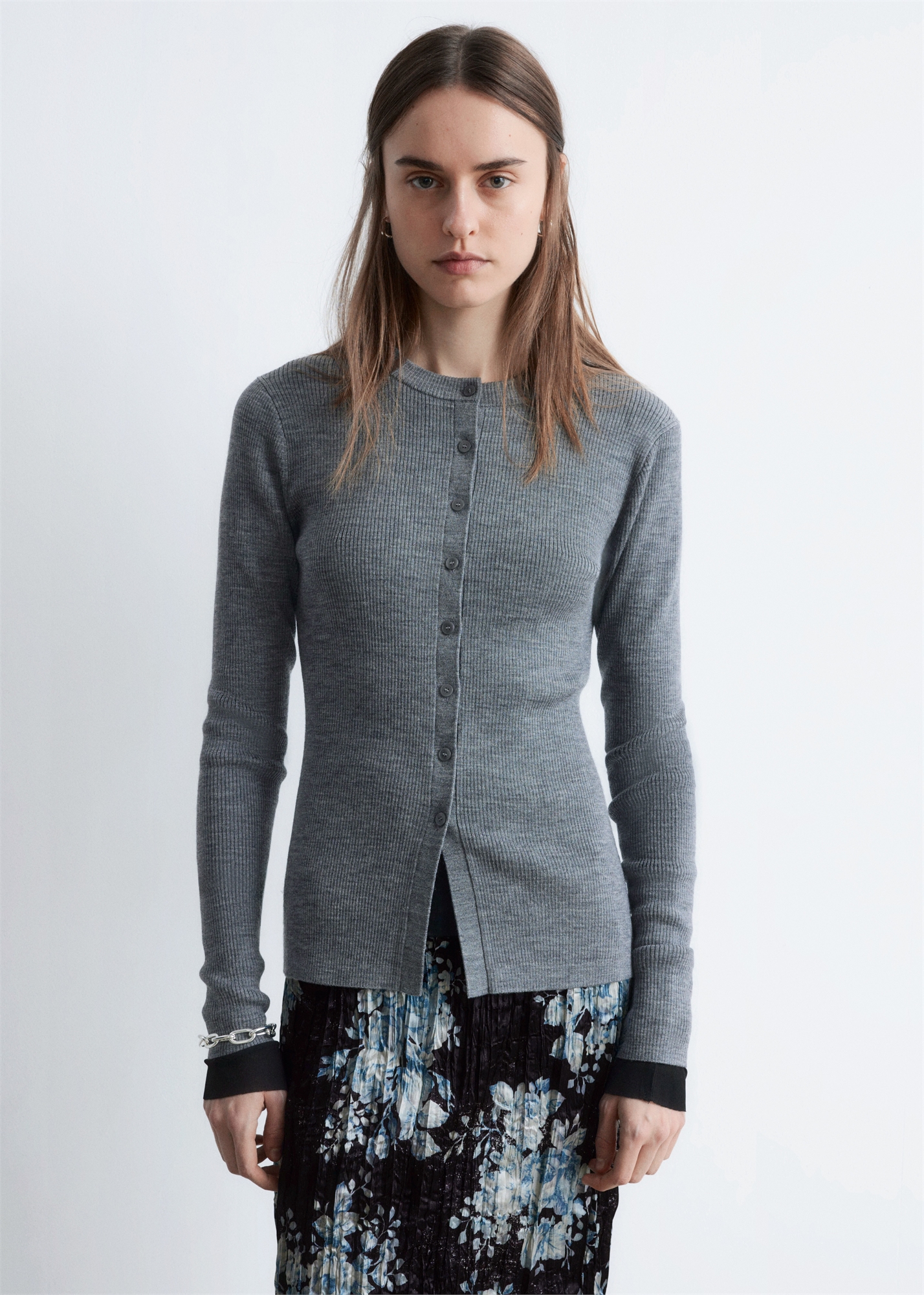 Вязаный в рубчик из мягкой мериносовой шерсти кардиган с длинными рукавами, облегающий силуэт и пуговицы спереди. Вырез отделан ребристой отделкой. Длина кардигана: 60 см / 23,6" (размер S)