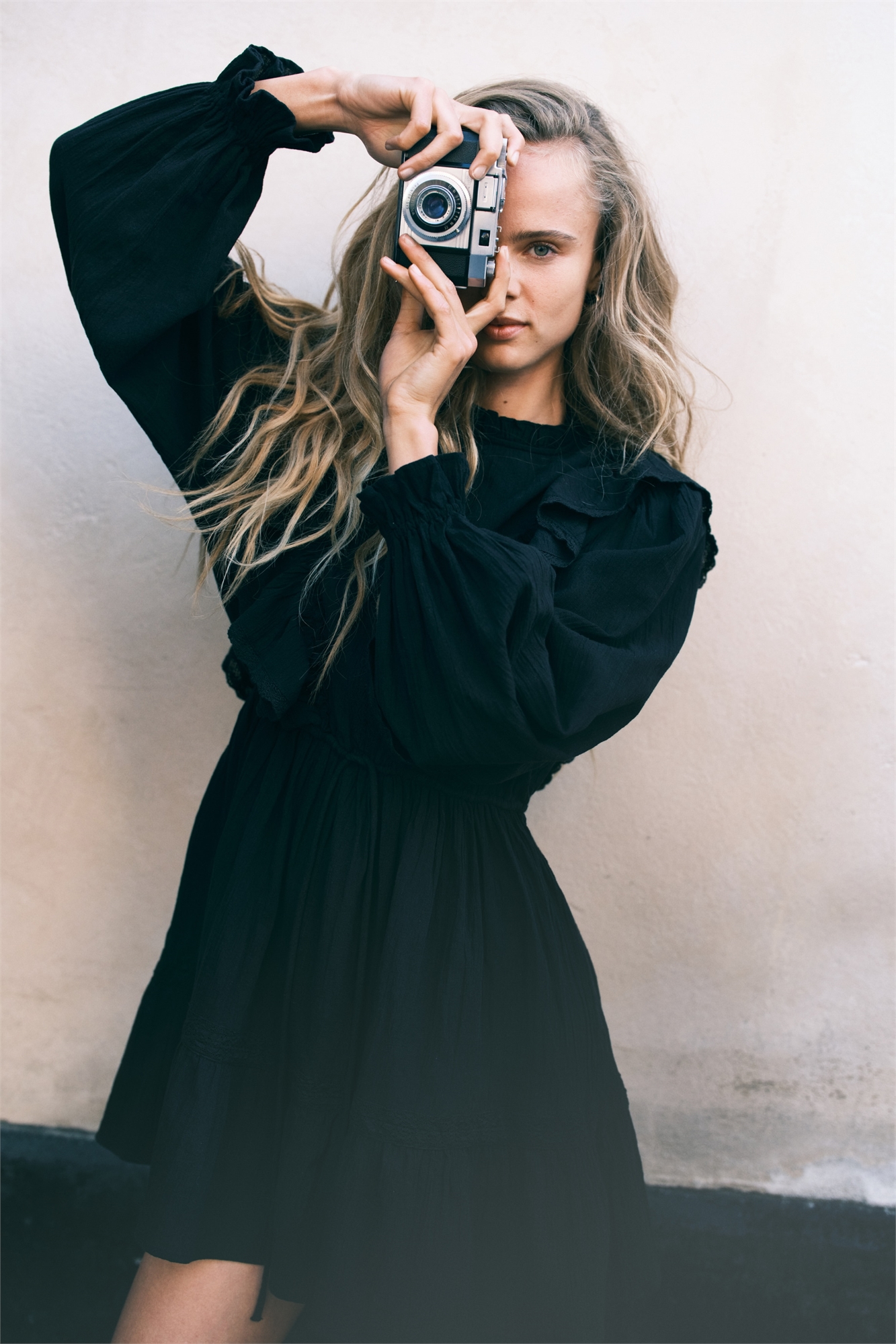 Короткое платье из смеси льна и хлопка, украшенное узкой кружевной отделкой и вставками. Воротник с окантовкой и отверстие для ключа с пуговицей сзади. Длинные рукава с расклешенными манжетами и узкой эластичной резинкой вокруг запястий. Эластичная резинка на талии с узкими завязками спереди и оборками, переходящими спереди через плечи на талию сзади. Расклешенная юбка со сборками для придания дополнительного объема. Без отделки.