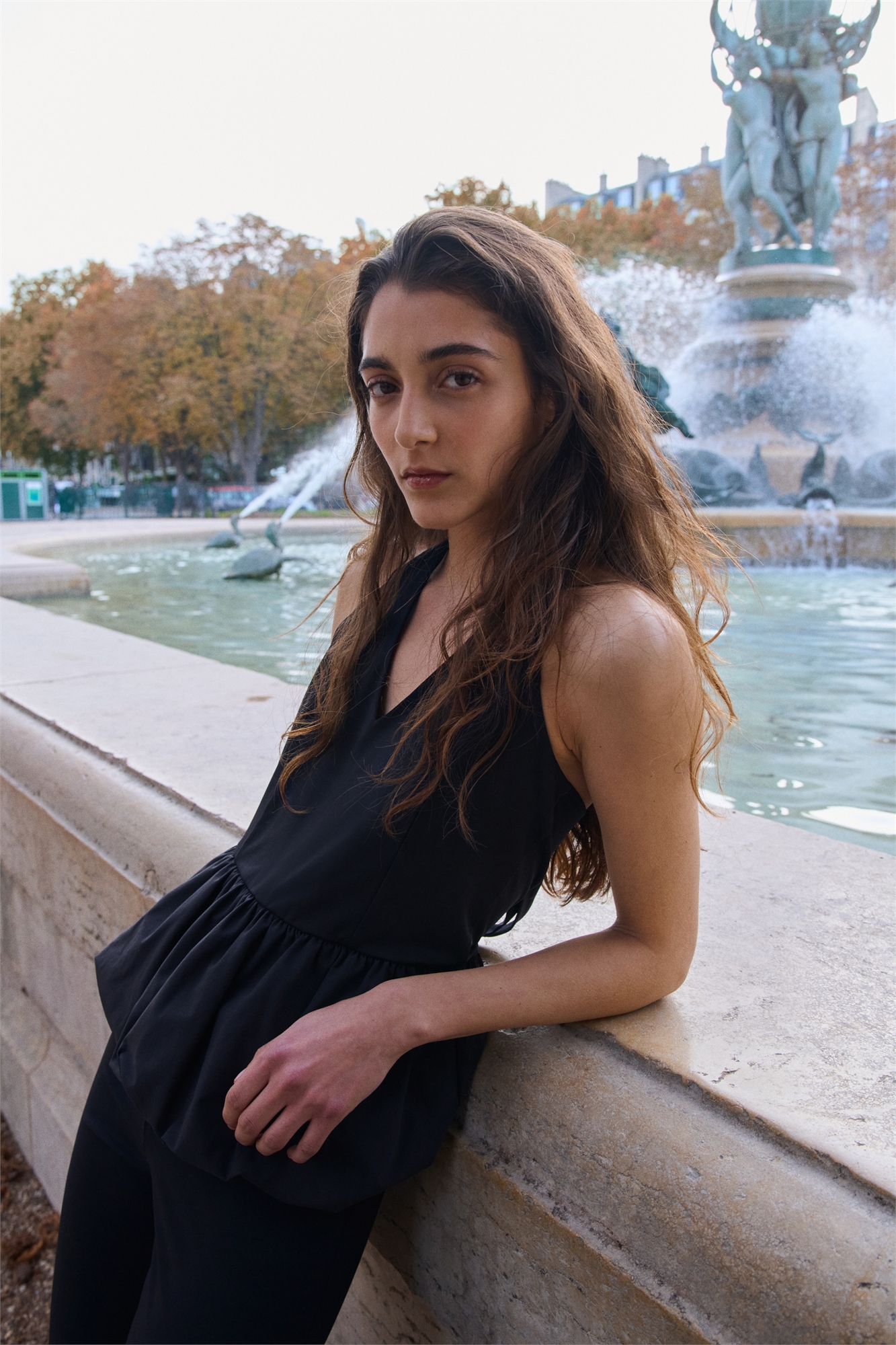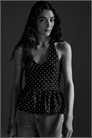 Короткий приталенный топ из плотного джерси с V-образным вырезом горловины с широкими завязками и пузырчатым подолом, создающим расклешенный пеплум.