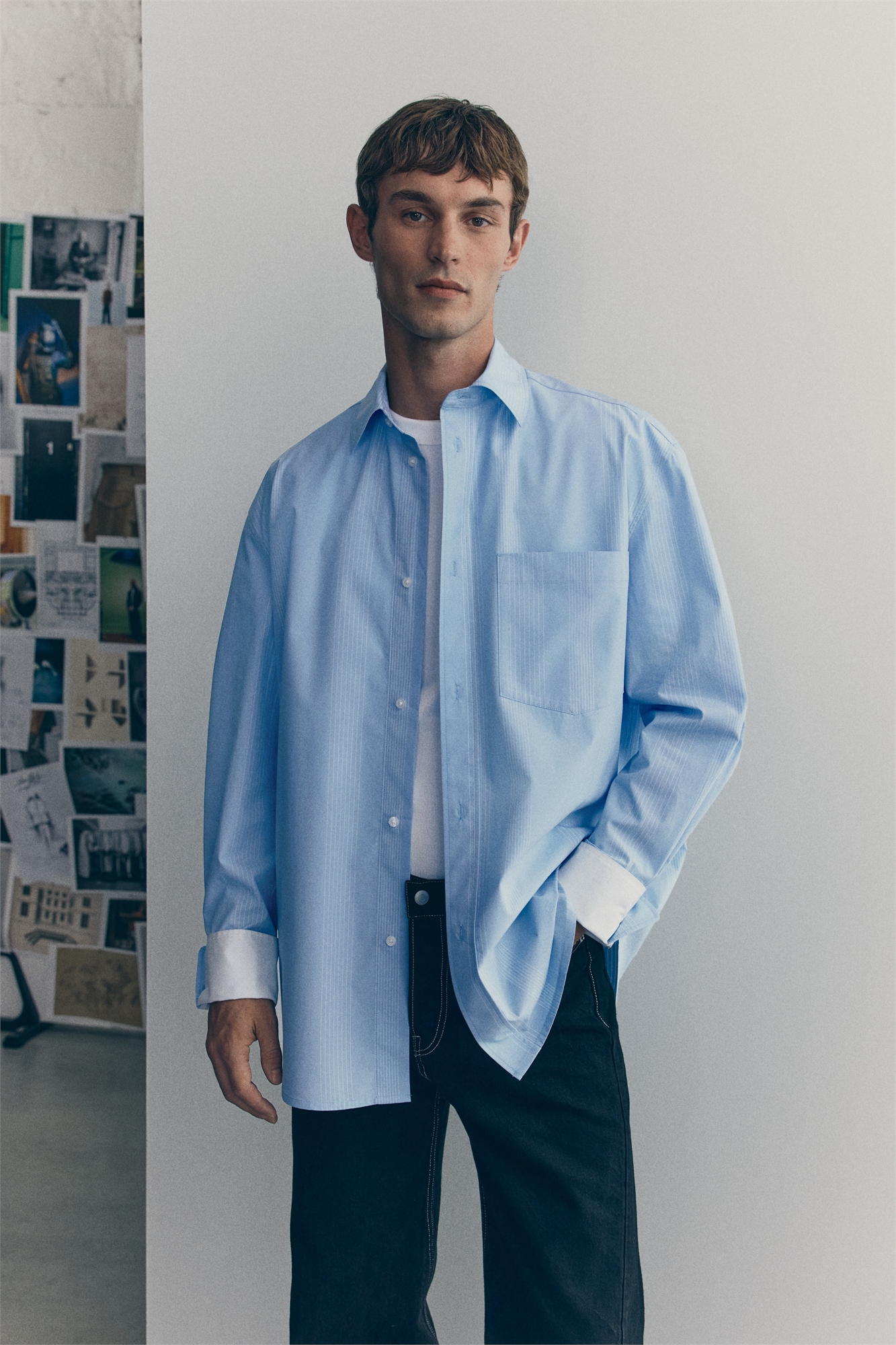 Рубашка из мягкого хлопкового полотна с отложным воротником, классическим передом, открытым нагрудным карманом и задним ярмом. Рубашка имеет свободный крой, длинные рукава с регулируемыми манжетами, которые можно подворачивать, и рукавную планку с пуговицей. Закругленный подол.