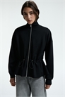 Толстовка больших размеров из плотного трикотажа с воротником-стойкой, застежкой-молнией спереди и эластичным шнурком со стопорами на талии, создающим расклешенный пеплум. Спущенные плечи и длинные рукава с манжетами в рубчик.