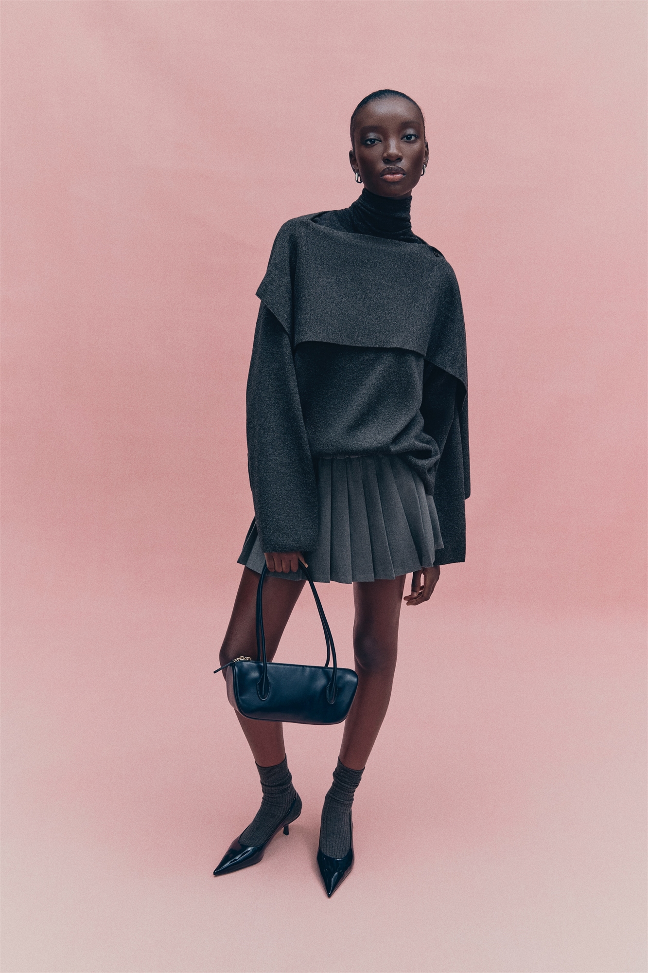 Джемпер оверсайз из мягкого трикотажа с драпировкой в виде шарфа, который застегивается на пуговицы на одном плече. Круглый вырез, спущенные плечи и длинные рукава.