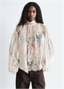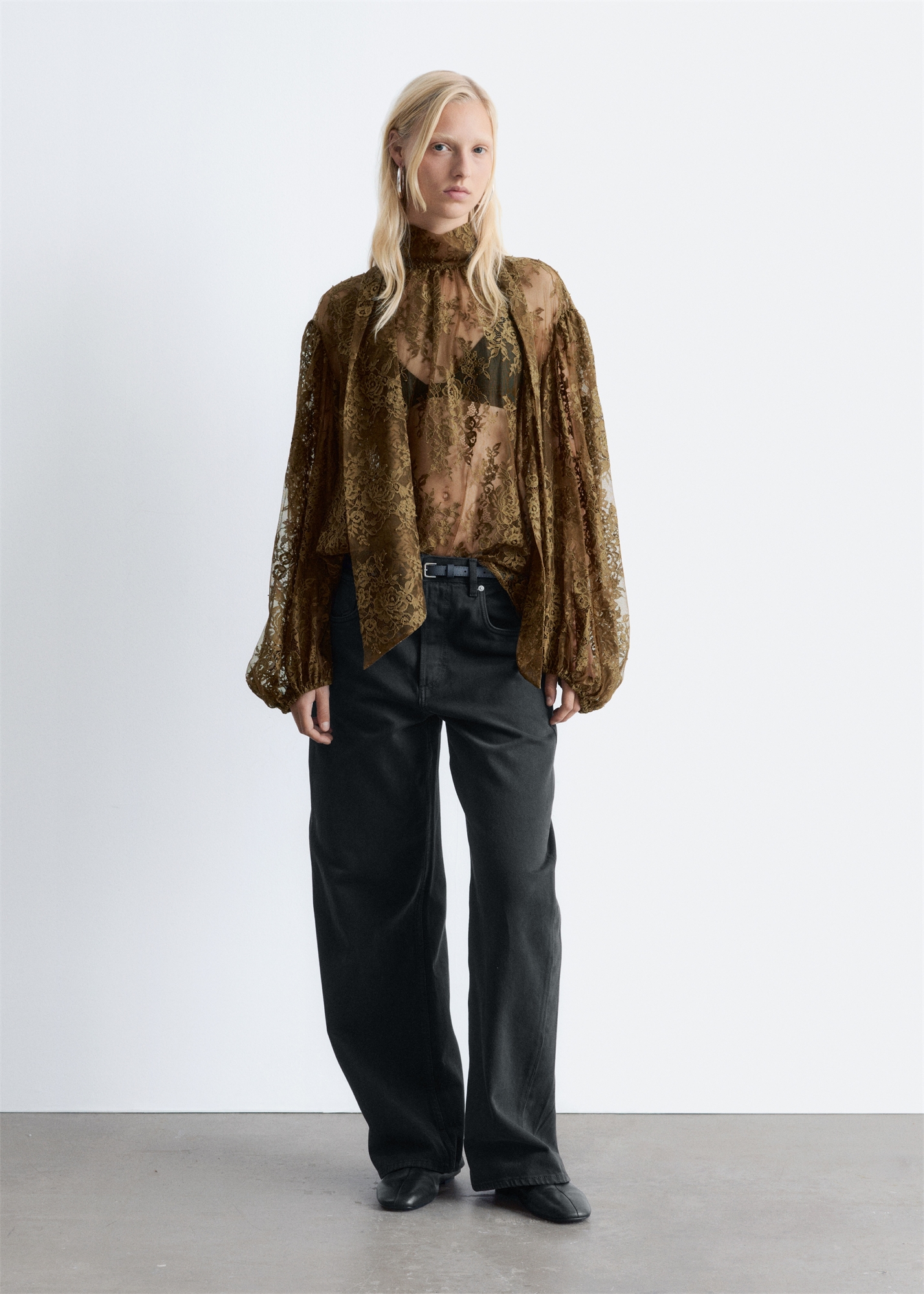 Эта блузка сшита из нежного кружева с полупрозрачным эффектом. Она имеет свободный силуэт, воротник-стойку с широкой лентой-бантом и объемные пышные рукава с эластичными манжетами. Блузка дополнена обрезным подолом и застежкой-пуговицей у горловины. Длина блузки: 64,5 см / 25,4" (размер S)