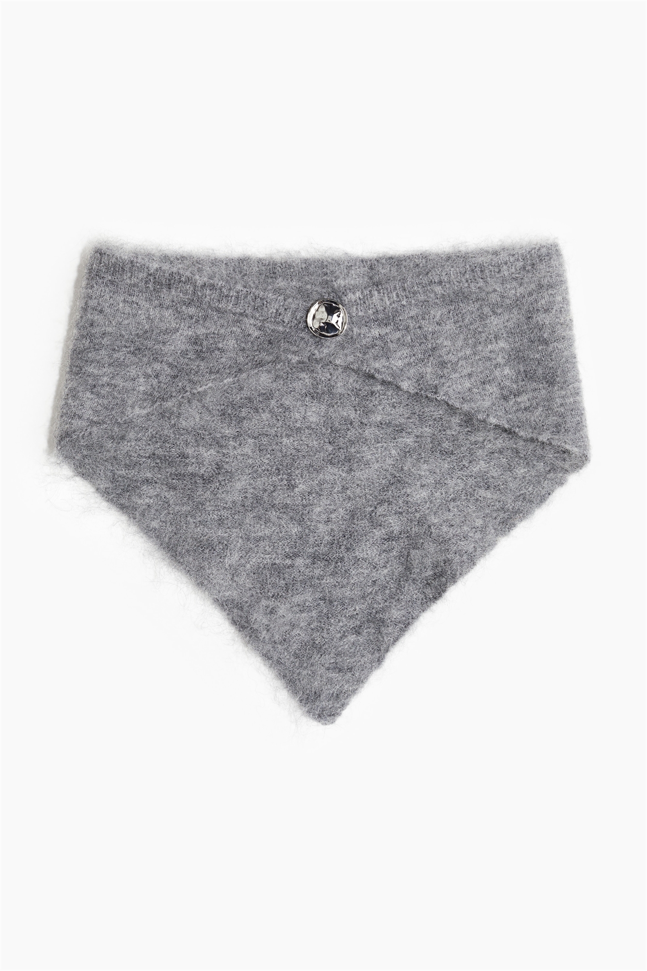 Треугольный шарф из мягкого трикотажа с содержанием мохера и шерсти, застегивающийся сзади на металлическую пуговицу нестандартной формы.