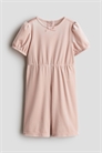 Ромпер из мягкого велюра с круглым вырезом, украшенным маленьким бантиком спереди. Застежка на кнопках сзади и эластичный шов на талии. Рукава-пуховики с узкими эластичными манжетами и длинные широкие ноги.