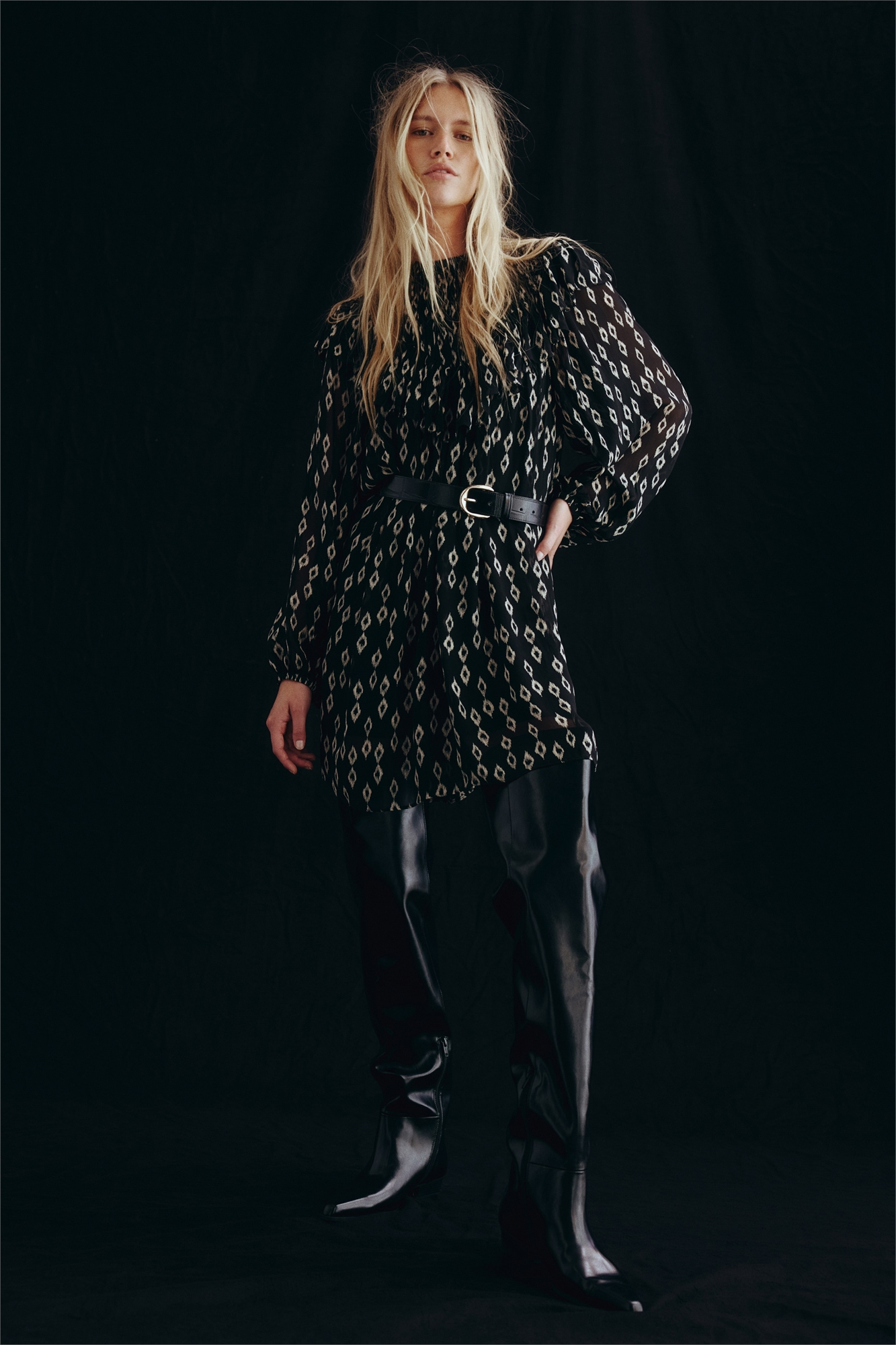 Короткое платье А-линии из полотняного переплетения с оборчатым воротником и отверстием для ключа с пуговицей сзади. V-образное ярмо со складками спереди и широкой оборкой, переходящей на плечи и спину. Длинные рукава-баллоны с эластичными манжетами. Нижнее платье с регулируемыми бретелями.