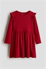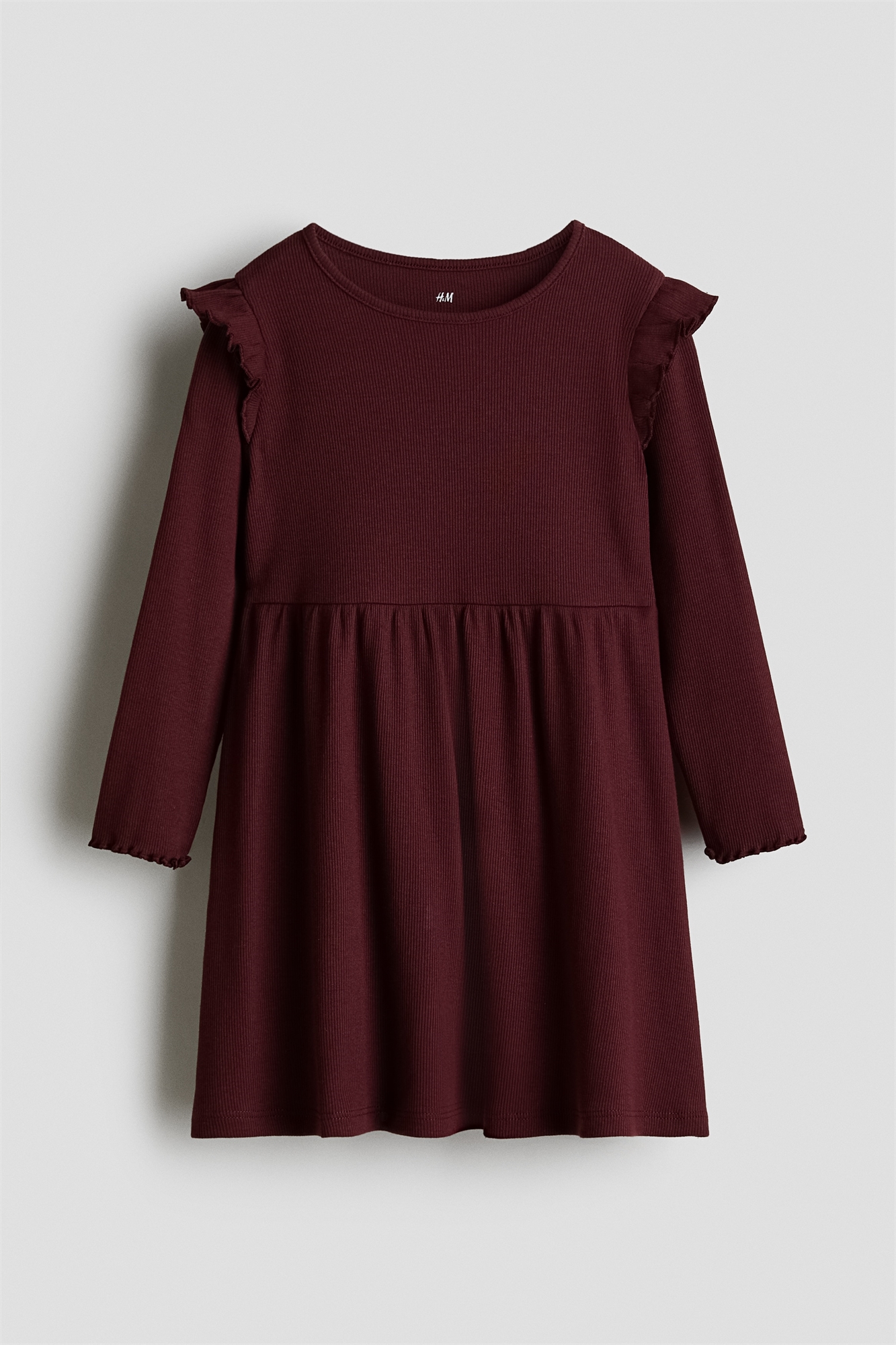 Платье из мягкого хлопкового микса с ребристой вязкой и оборкой на плечах. Круглый вырез, длинные рукава с манжетами, обработанными оверлоком, и сборка на талии.