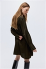 Платье длиной до колена из мятого полотна с круглым вырезом с отделкой и прорезью с куполообразной металлической пуговицей спереди. Длинные рукава с разрезом и широкие манжеты с пуговицей. Без подкладки.