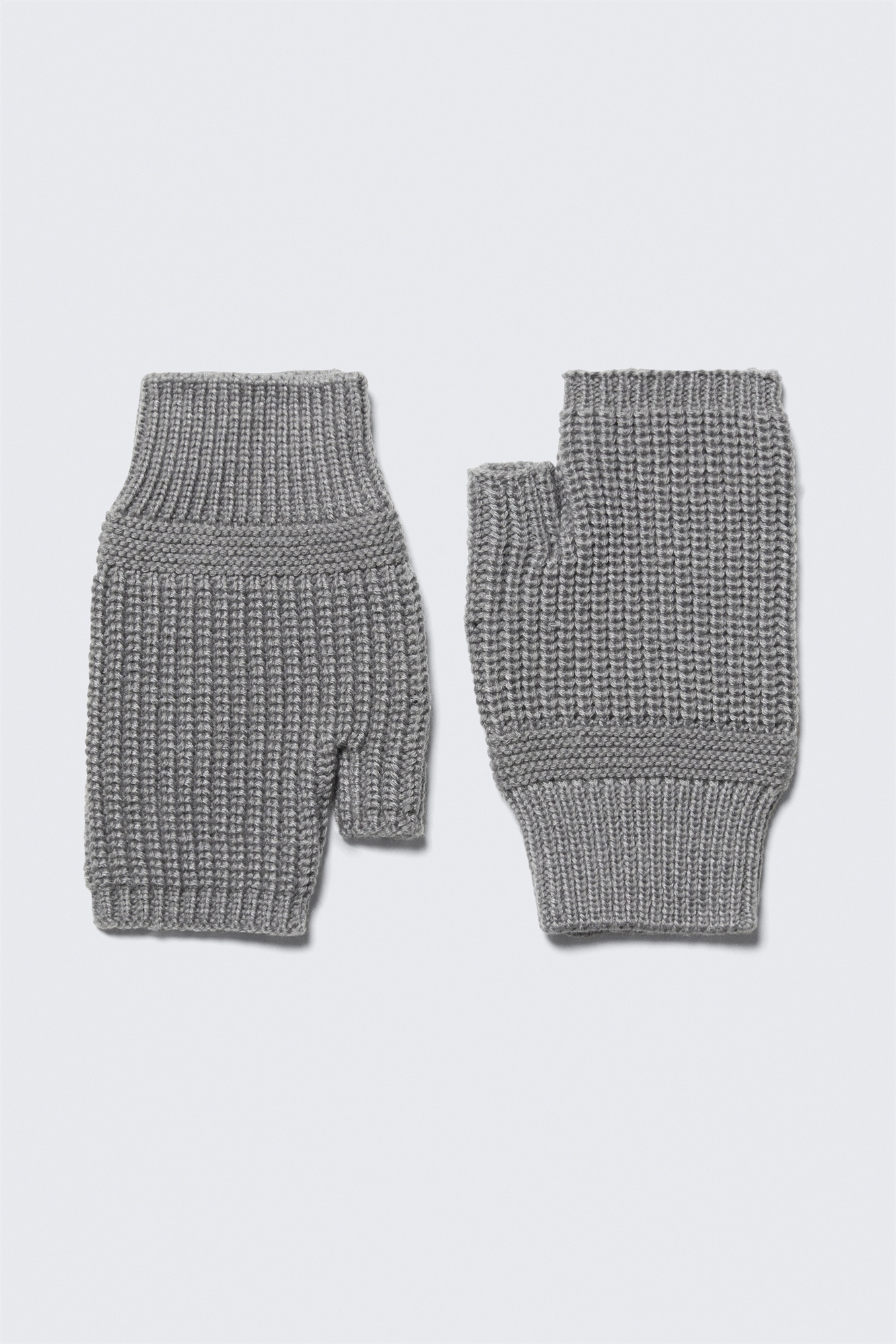 Пара мохнатых варежек без пальцев из фактурной вязки. Изготовленные из мягкой пряжи, они имеют ребристую манжету и открытые пальцы для легкости и подвижности. Варежки плотно облегают руку и имеют слегка утолщенную структуру для дополнительного тепла и комфорта.
