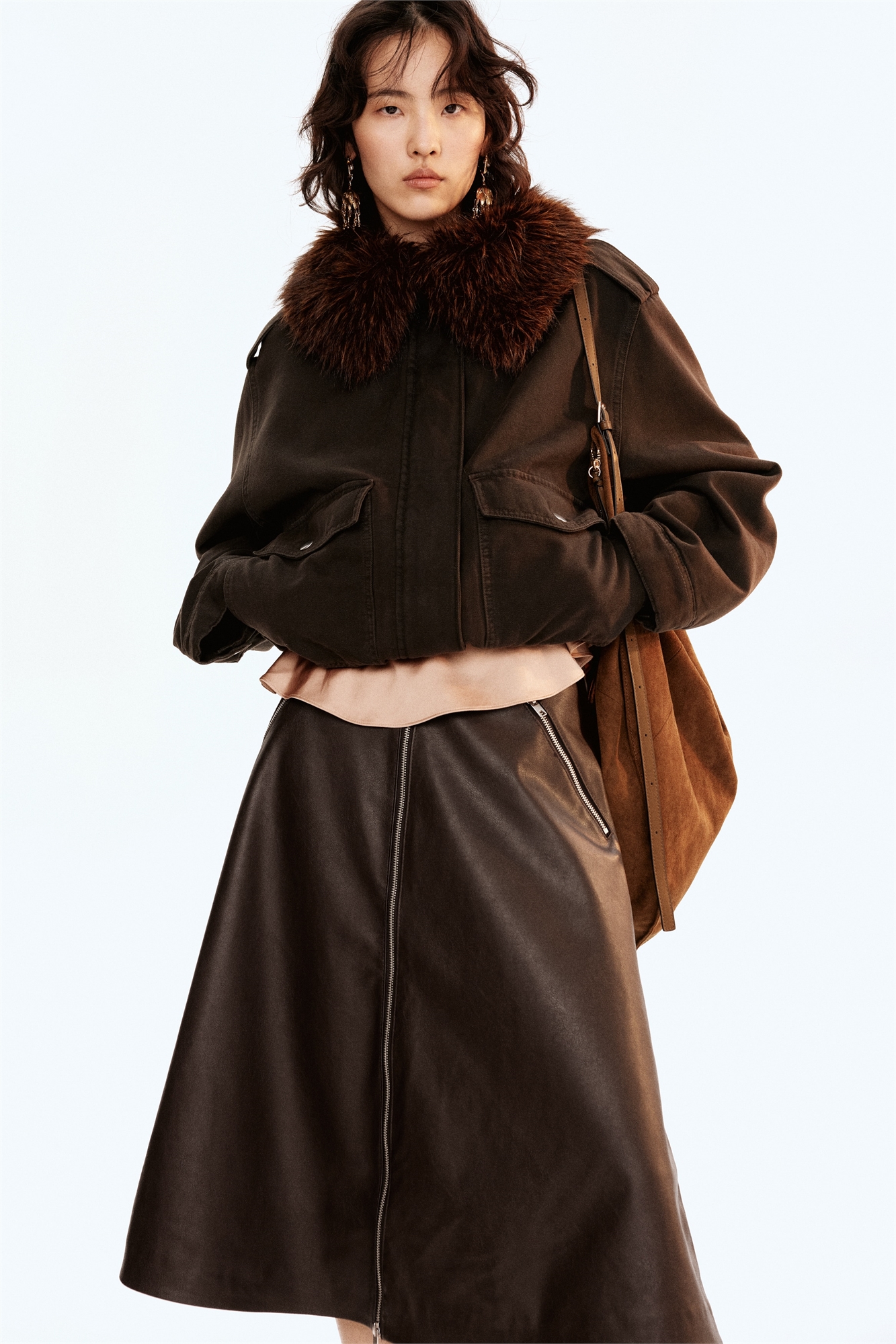 Юбка А-линии длиной до колен из мелованной ткани с высокой талией и удлиненным поясом с застежкой на кнопки. Свободный крой, диагональные передние карманы на молнии и двусторонняя застежка-молния спереди - универсальные варианты укладки. На подкладке.