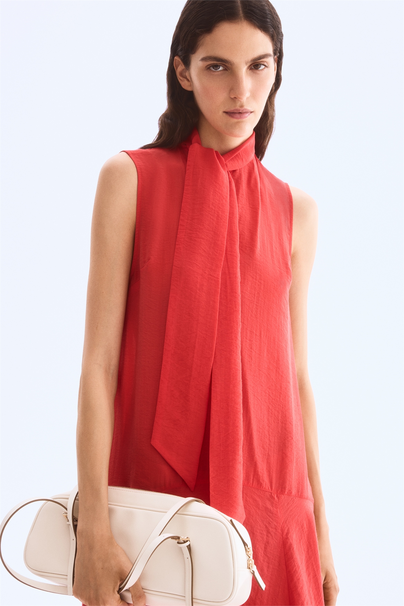 Длинное платье без рукавов из органзы из смеси лиоцелла. Воротник-стойка с V-образным вырезом и длинными завязками спереди. Вытачки на груди, формирующие швы сзади, фигурный шов ниже бедер и объемная юбка. Потайная застежка-молния с одной стороны. Без подкладки.