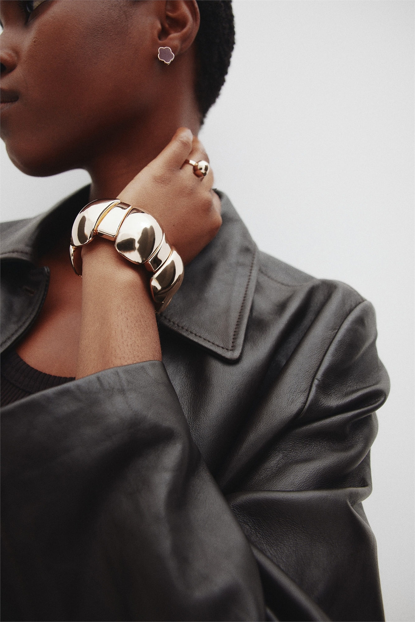 Мощный браслет из пластика с блестящим металлическим покрытием.