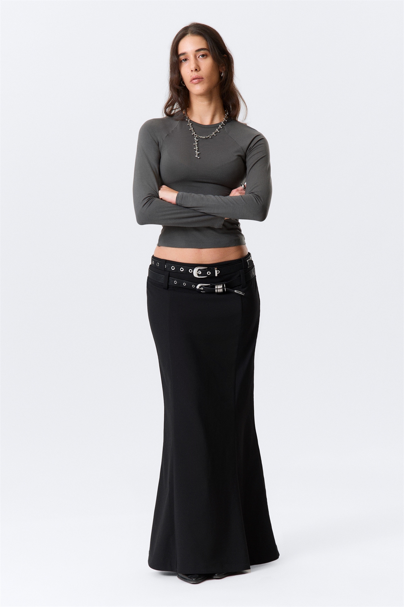 Приталенная юбка-макси из гладкой костюмной ткани с мягкой драпировкой. Юбка с заниженной талией и узкой посадкой на бедрах, которая плавно расширяется к подолу, придавая силуэту плавность. С петлями для ремня и застежкой-молнией по центру спины.