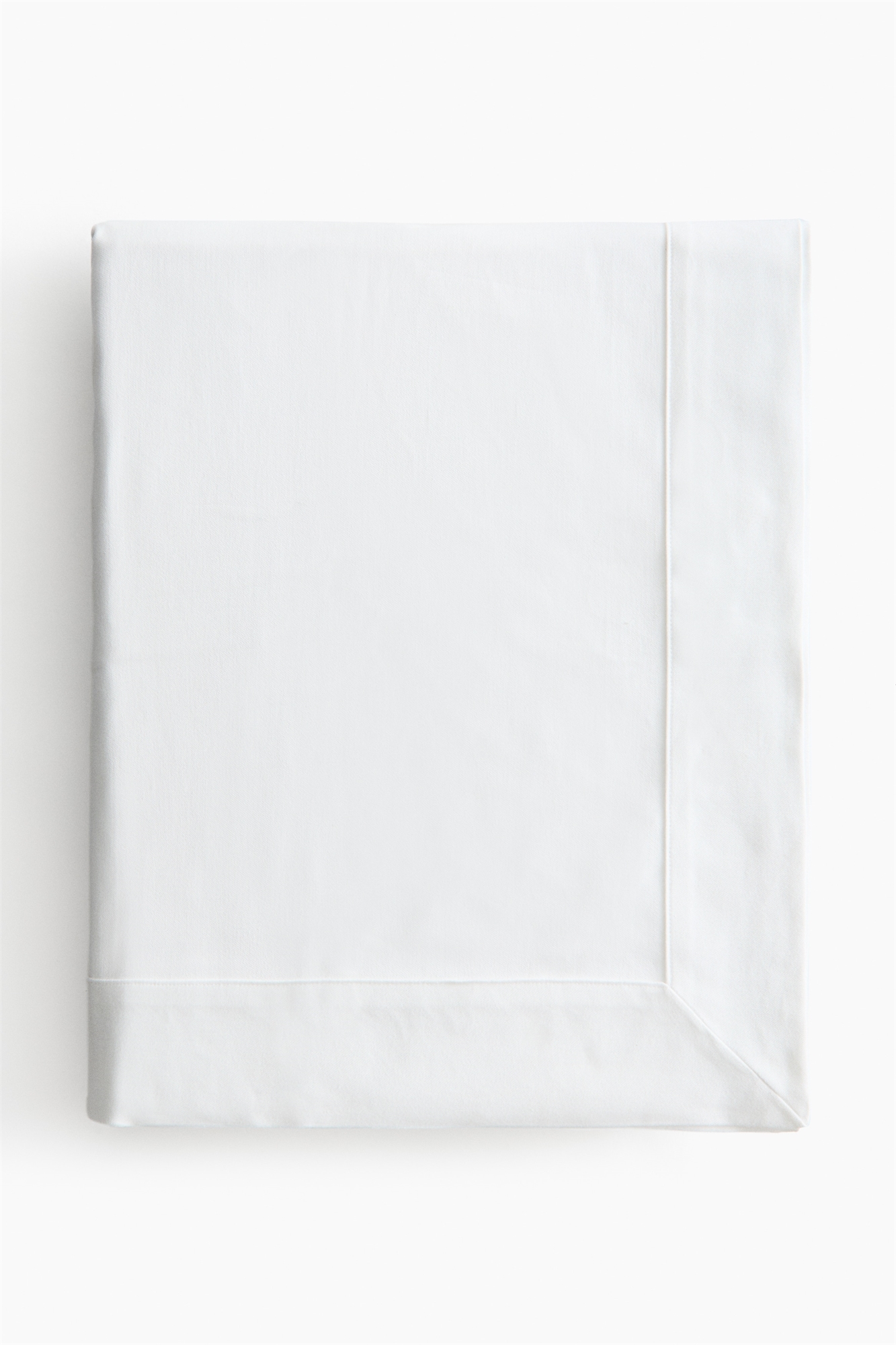 Скатерть из классического хлопкового дамаска с простроченными каймами и подрезанными углами для четкого, изысканного вида.