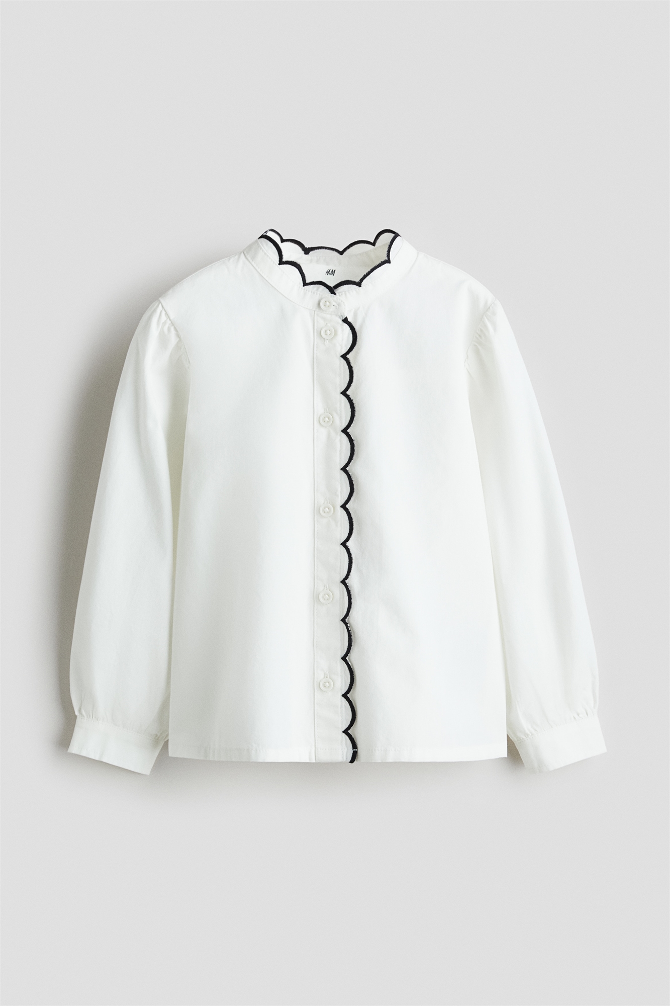 Блузка с длинными рукавами из мягкого хлопкового поплина с декоративными деталями. Небольшой воротник-стойка, пуговицы спереди и объемные рукава.