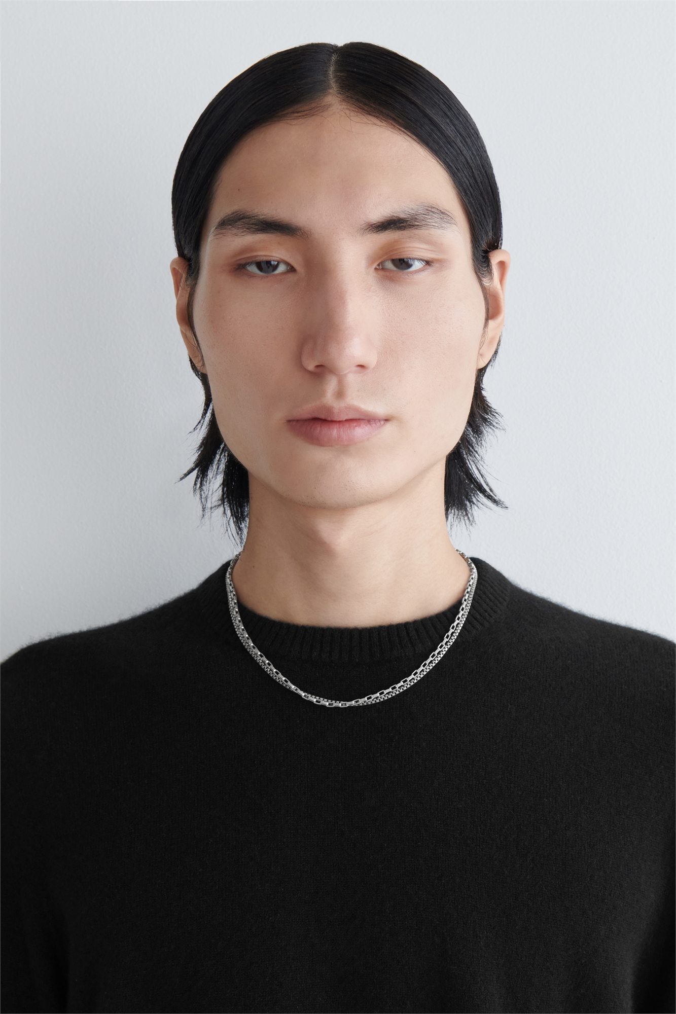 Это современное ожерелье добавит нотку изысканности в ваш повседневный гардероб. Аксессуар изготовлен из посеребренной переработанной латуни и состоит из двух цепочек, соединенных одной застежкой. Застежка-лобстерЛатунь - универсальный материал, который может быть переработан несколько раз без потери своих свойств Верхний материал: 100 % переработанная постпотребительская латунь. Покрытие: 100 % серебро. Детали, кроме длины в размере S/M = 38 см, в размере L/XL = 42 см
