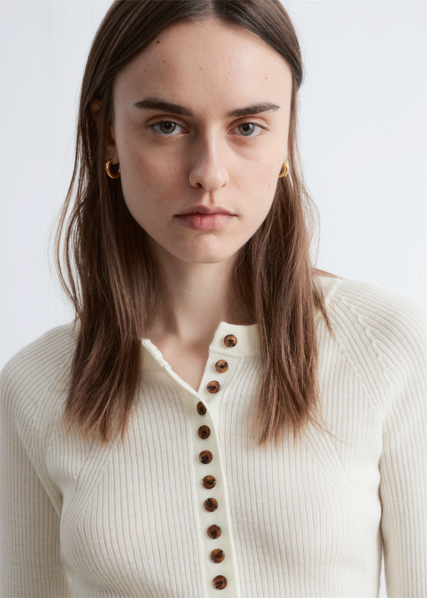 Эта шерстяная рубашка с длинными рукавами, вязанная в рубчик, имеет круглый вырез и застегивающуюся наполовину пуговичную петлю. Зауженный крой Обычная длина