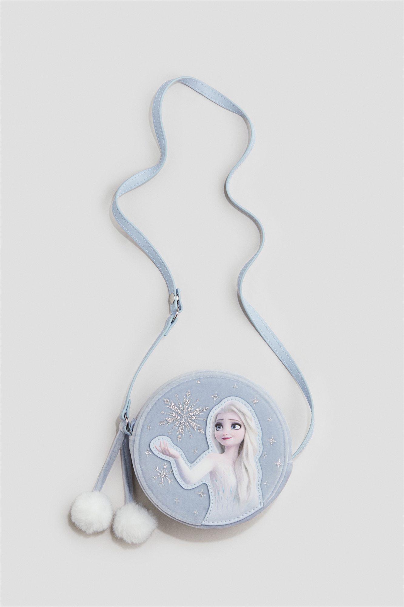 Круглая сумка на плечо из бархата с блестящими узорами и аппликацией спереди. Застежка-молния сверху и декоративные помпоны с одной стороны. Узкий плечевой ремень с отстегивающейся застежкой на одном конце. На подкладке.