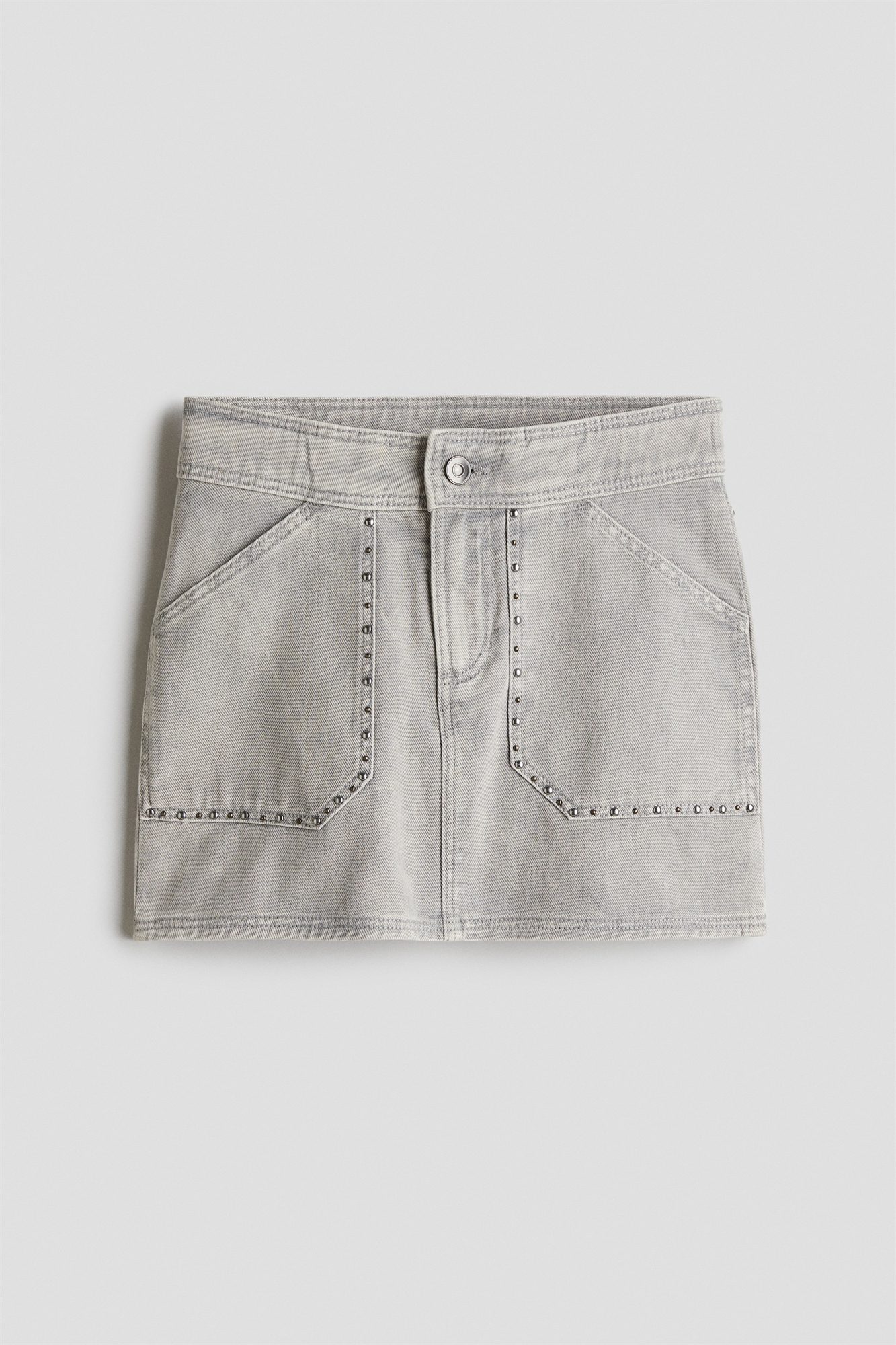 Юбка из хлопкового денима, украшенная шипами спереди и сзади. Регулируемый, эластичный пояс, застежка на молнию и пуговицу, карманы спереди и ярмо сзади.