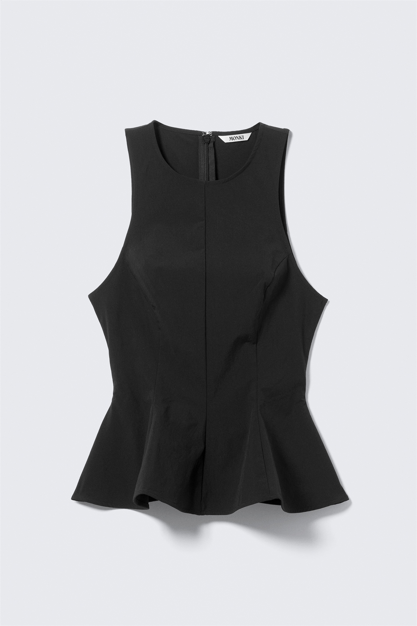 Топ без рукавов со складками изготовлен из тонкой нейлоновой ткани вторичной переработки. С круглым вырезом, невидимой застежкой-молнией сзади и приталенным силуэтом.