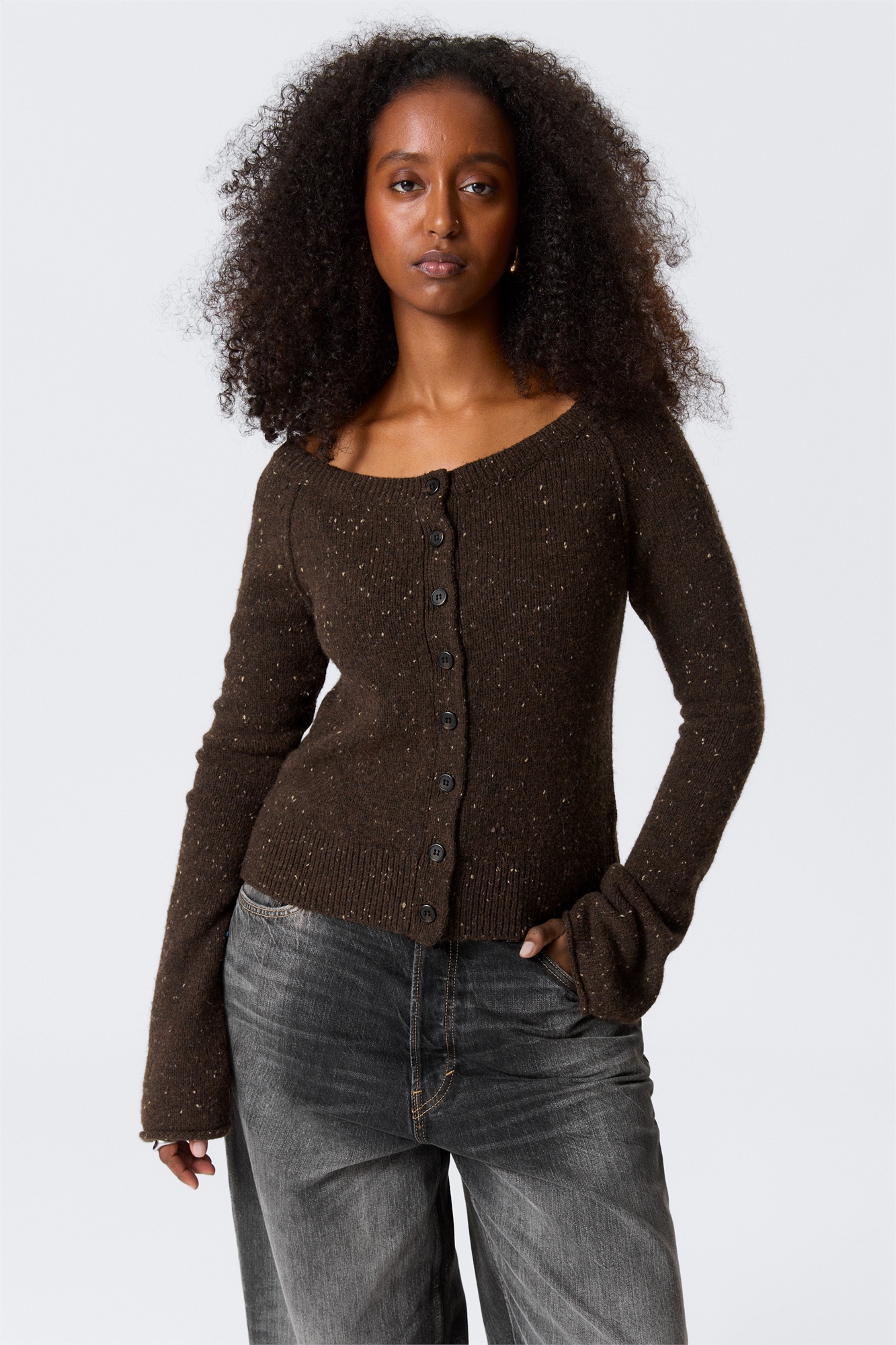 Кардиган на пуговицах с широким вырезом и непринужденным кроем. Вязаный из мягкой шерстяной смеси с добавлением альпаки, он имеет рукава-трубы и закатанный подол для создания тонкой текстуры. Кардиган с отделкой в виде начеса и полностью выполненными деталями - изысканный повседневный вариант.