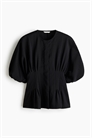 Блузка из тканого материала с круглым вырезом и потайными пуговицами спереди. Рукава-баллон длиной до локтя с эластичными манжетами и складками на талии для приталенного силуэта.