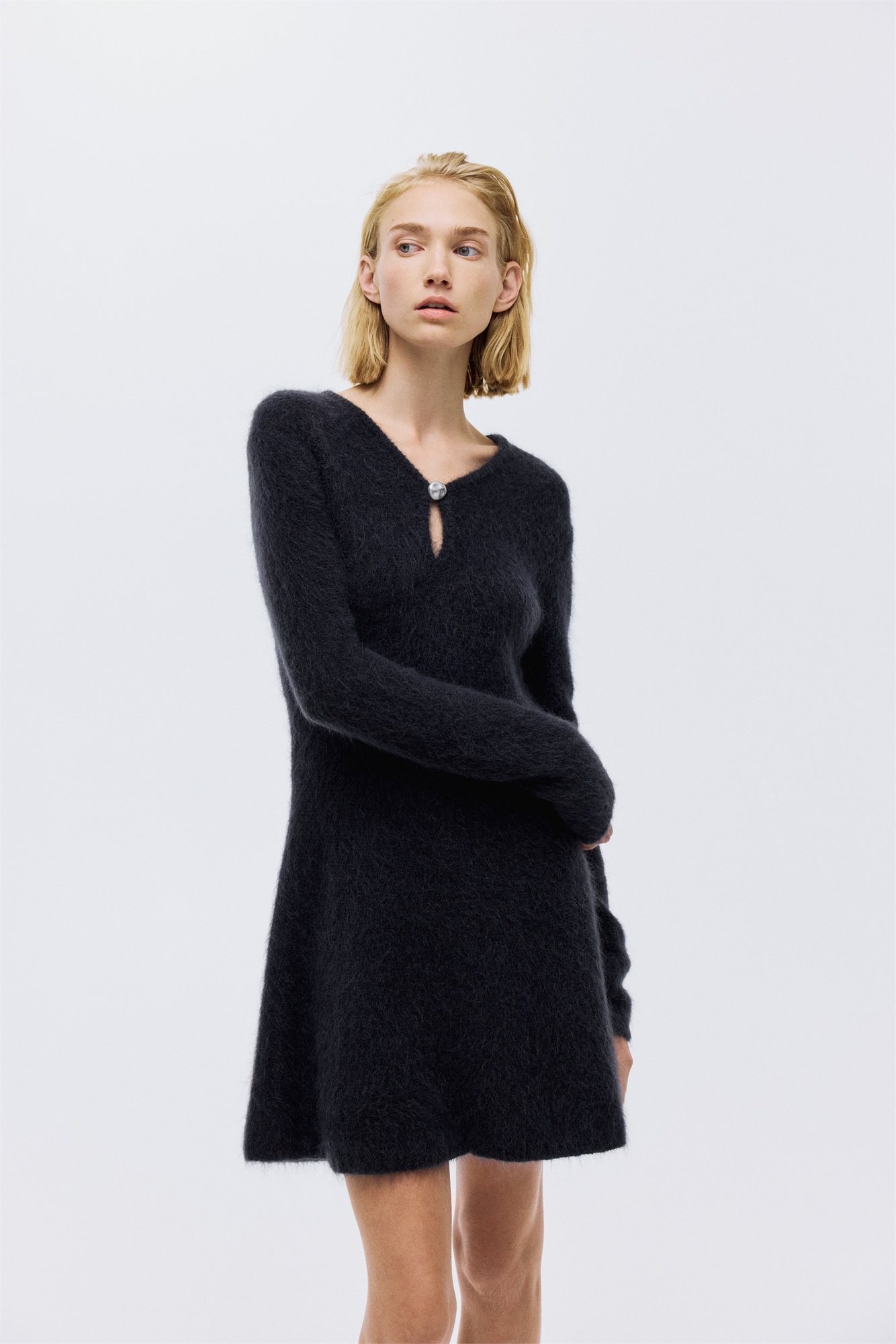 Короткое платье из мягкого трикотажа с содержанием мохера и шерсти. V-образный вырез и отверстие для ключа с декоративной пуговицей спереди. Длинные рукава и расклешенная юбка.