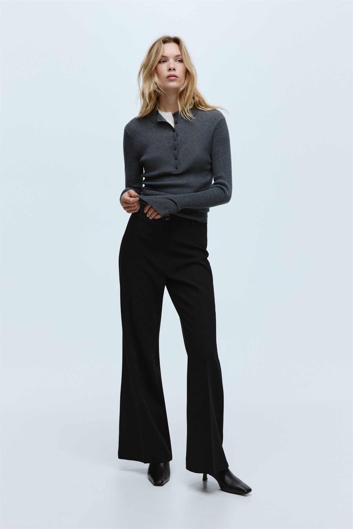 Приталенные брюки из тканого материала с высокой талией, застежкой на молнию и пуговицу. Накладные карманы спереди и сзади, расклешенные ноги со складками спереди и сзади.