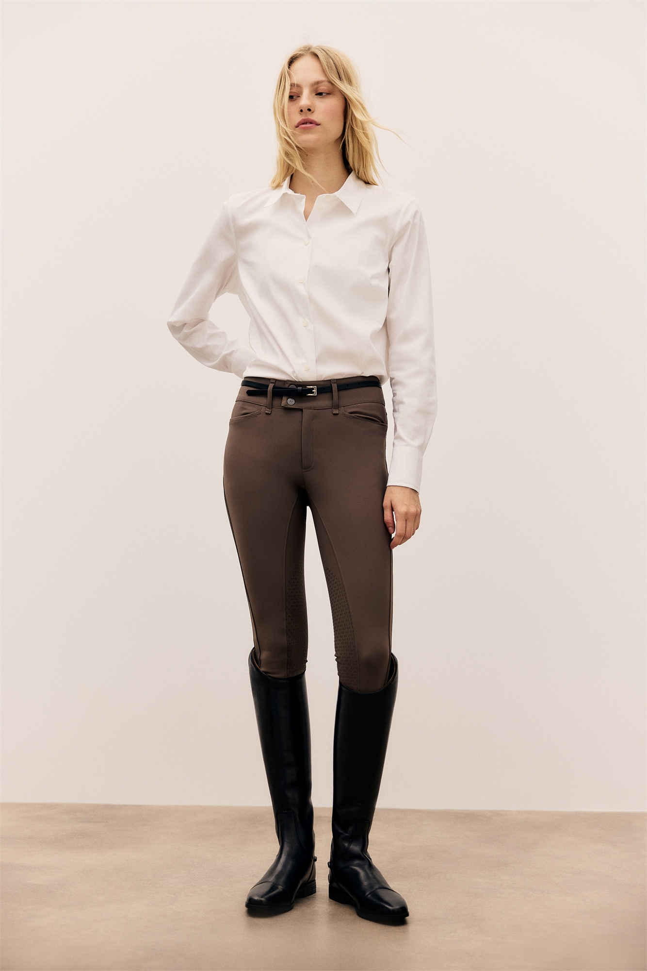 Бриджи из функциональной ткани с четырехсторонней растяжкой для дополнительного комфорта и свободы движений. Высокая талия с эластичной отделкой, застежка-молния и удлиненный пояс с декоративными пуговицами и скрытой застежкой на крючки и штангу. Передние карманы с местом для мобильного телефона и втачные карманы сзади с декоративной пуговицей. Эластичные завязки на подоле. Силиконовый наколенник для надежной фиксации в седле.