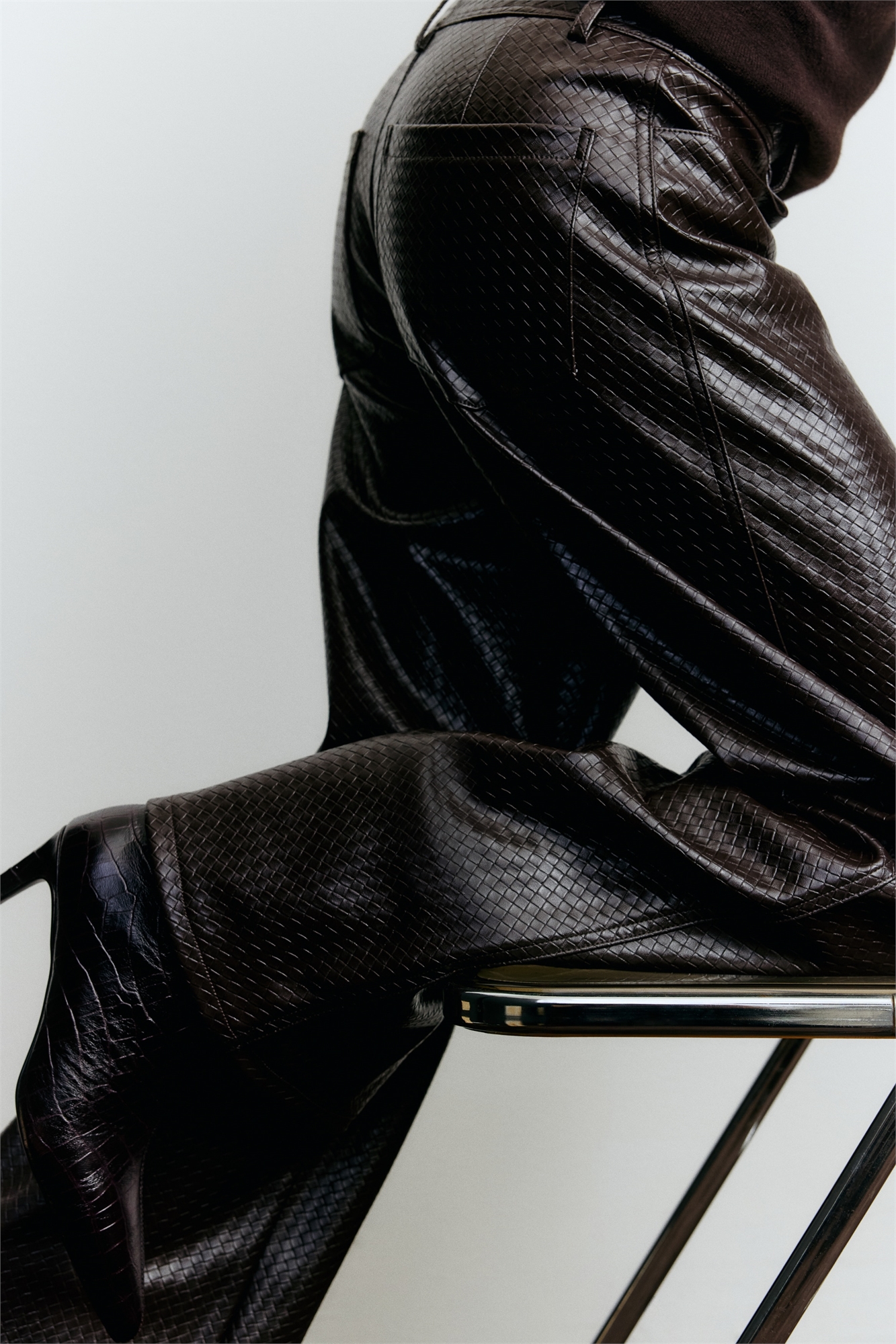 Брюки из ткани с покрытием, с узором в виде ромбов, с высокой талией, застежкой на молнию и пуговицу. Передние и задние карманы и прямые ноги.