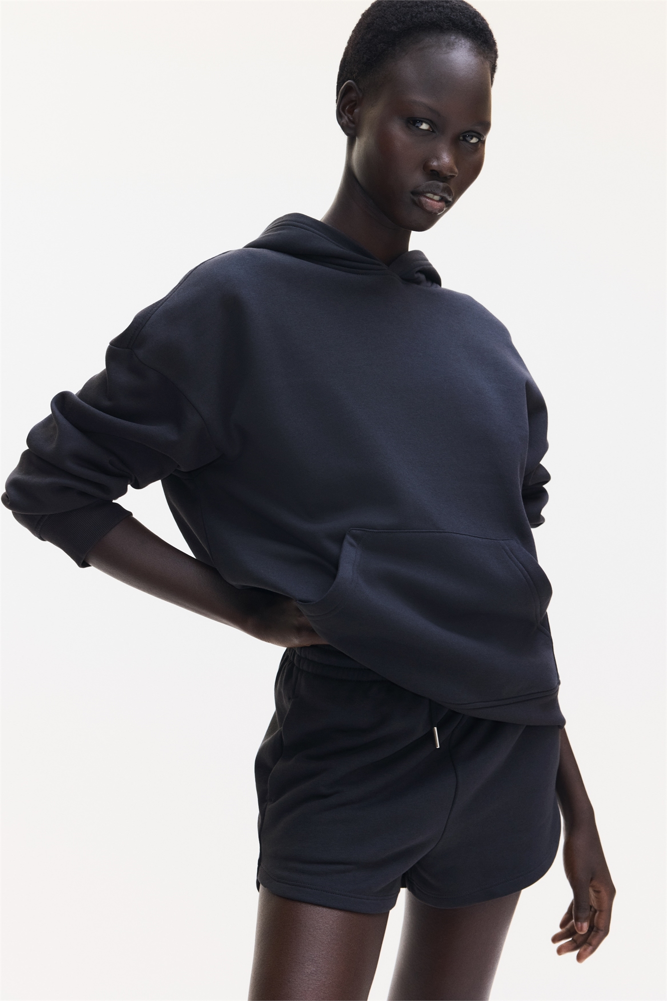 Толстовка из толстовочной ткани с мягким начесом внутри. Двухслойный капюшон, спущенные плечи и карман-кенгуру. Ребристые манжеты и подол.