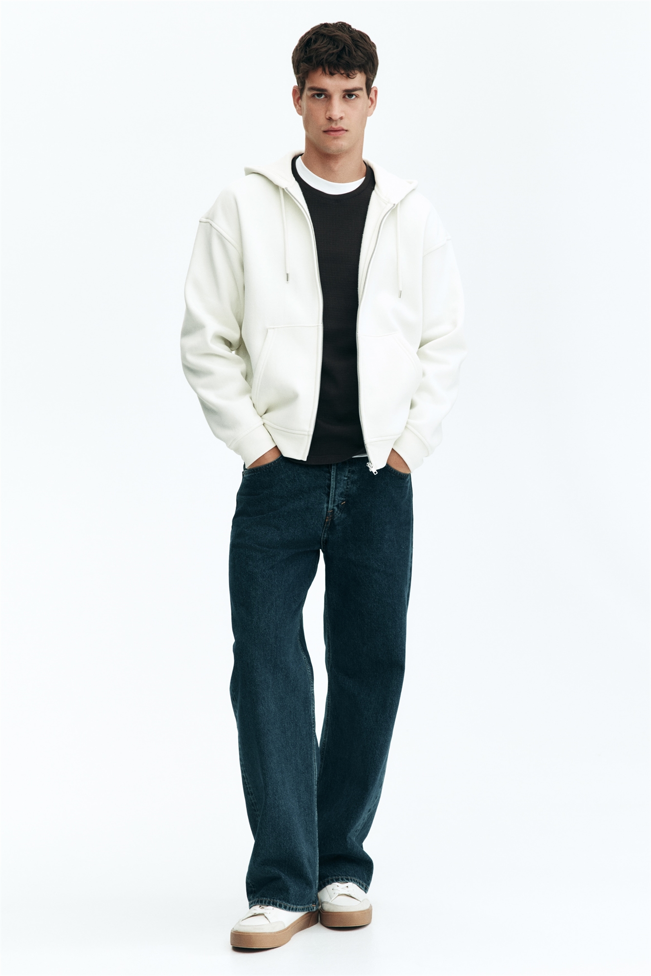 Толстовка на молнии из толстовочной ткани средней плотности с мягкой начесом внутри. Капюшон с утягивающим шнурком, застежка-молния спереди и передние карманы. Спущенные плечи, длинные рукава, манжеты и подол в рубчик. Свободный крой для пышного, но не чрезмерно большого силуэта.