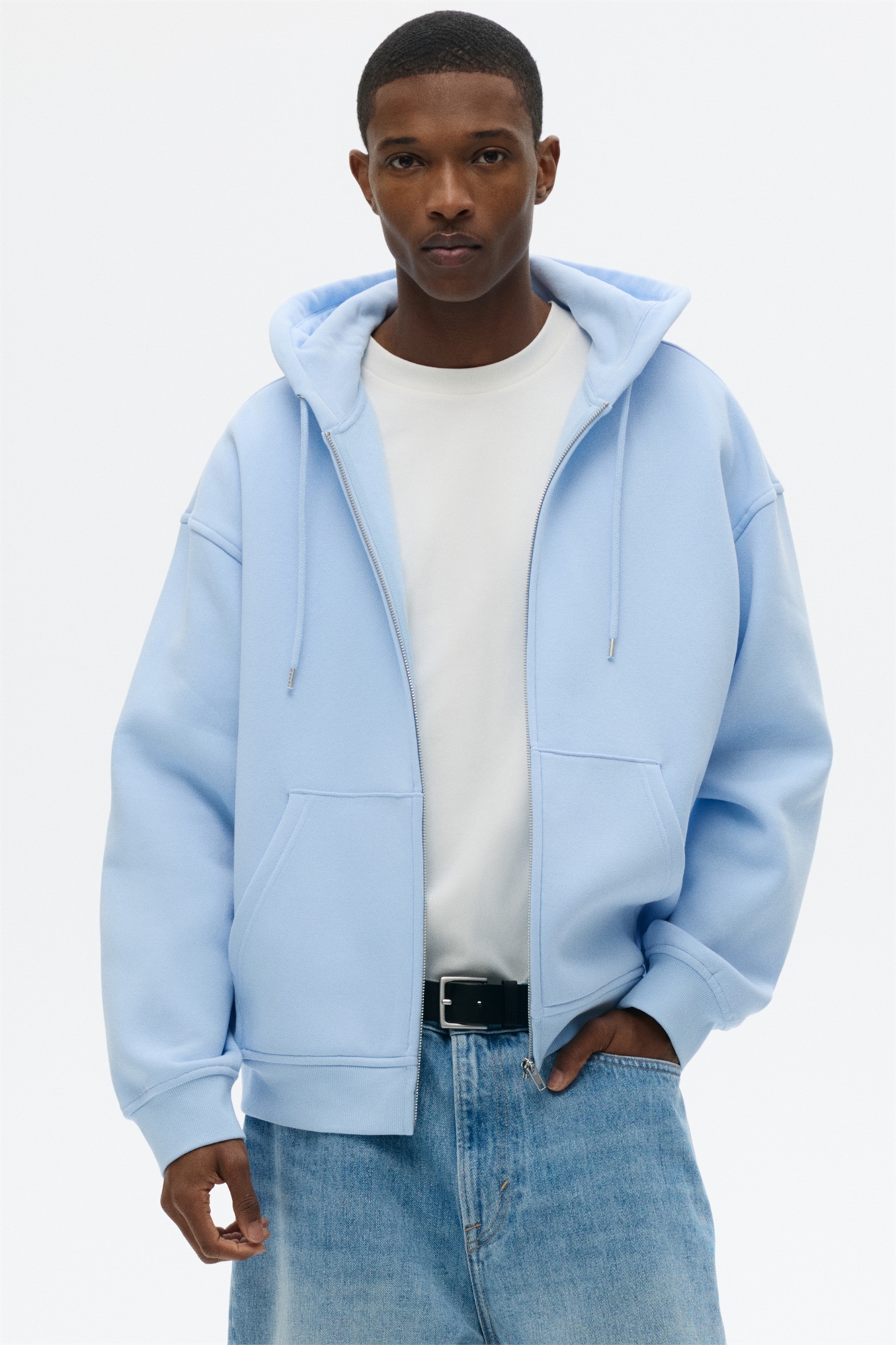 Толстовка на молнии из толстовочной ткани средней плотности с мягкой начесом внутри. Капюшон с утягивающим шнурком, застежка-молния спереди и передние карманы. Спущенные плечи, длинные рукава, манжеты и подол в рубчик. Свободный крой для пышного, но не чрезмерно большого силуэта.