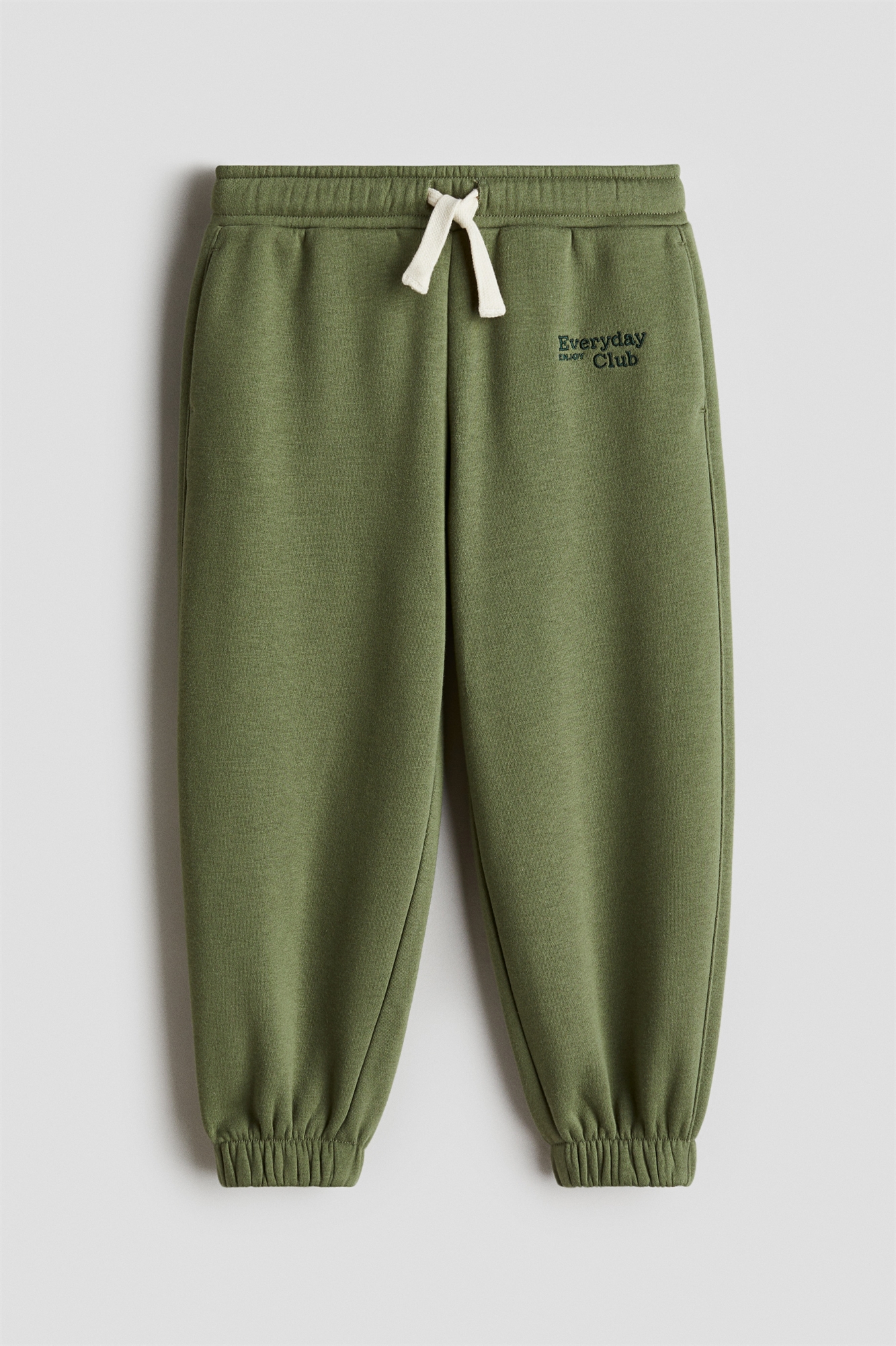Джоггеры из толстовочной ткани с мягкой ворсистой внутренней стороной и вышитым текстовым мотивом спереди. Эластичный пояс с завязками, карманы в боковых швах и эластичная резинка по краям.