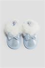 Тапочки из блестящей ворсистой ткани с пушистой отделкой и декоративным бантиком спереди (размеры 7-9,5 с эластичным ремешком на пятке). Пушистые подкладки и стельки с принтом. Подошва с рисунком.