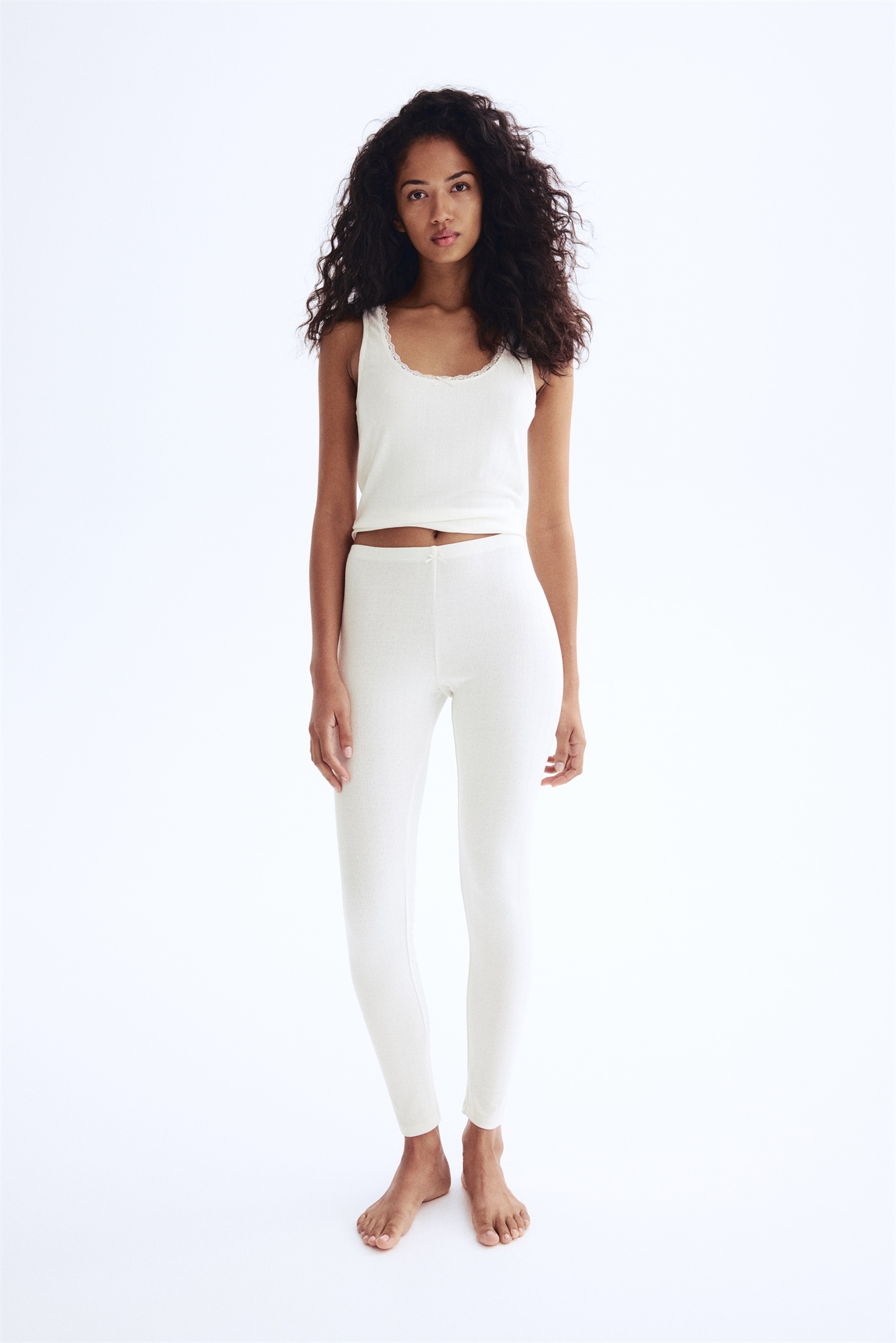 Облегающая пижама с жилетом и леггинсами из мягкого трикотажа пуантель. Жилет-топ с широкими бретелями и кружевной отделкой по вырезу горловины. Леггинсы с узкой резинкой и декоративным атласным бантом на талии.