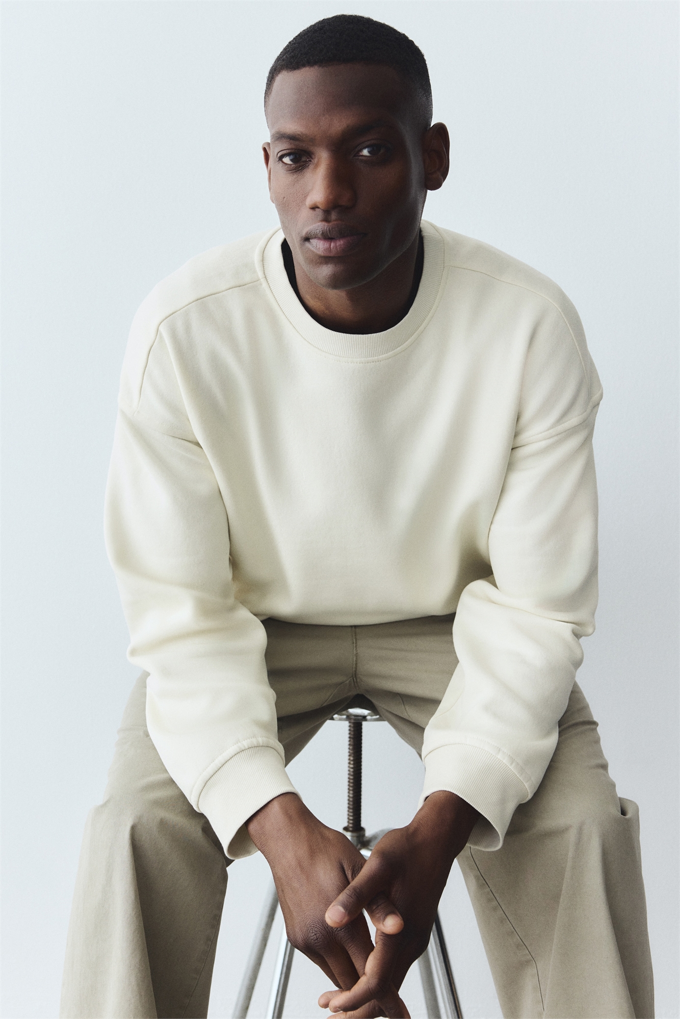 Свитшот Loose Fit средней плотности из смеси хлопка с мягкой ворсистой изнанкой. Круглый вырез в рубчик, спущенные плечи, длинные рукава, широкая тесьма на манжетах и подоле. Свободный крой для пышного, но не чрезмерно объемного силуэта.