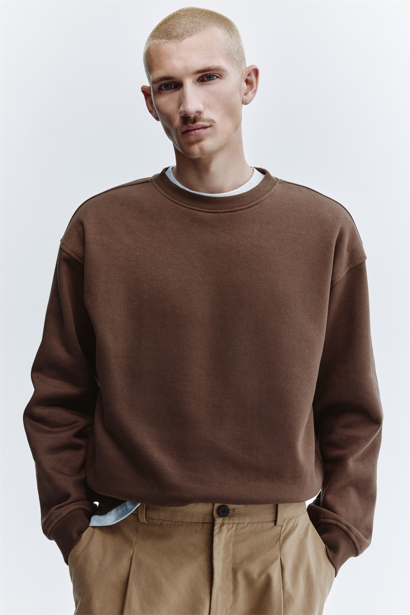 Свитшот Loose Fit средней плотности из смеси хлопка с мягкой ворсистой изнанкой. Круглый вырез в рубчик, спущенные плечи, длинные рукава, широкая тесьма на манжетах и подоле. Свободный крой для пышного, но не чрезмерно объемного силуэта.