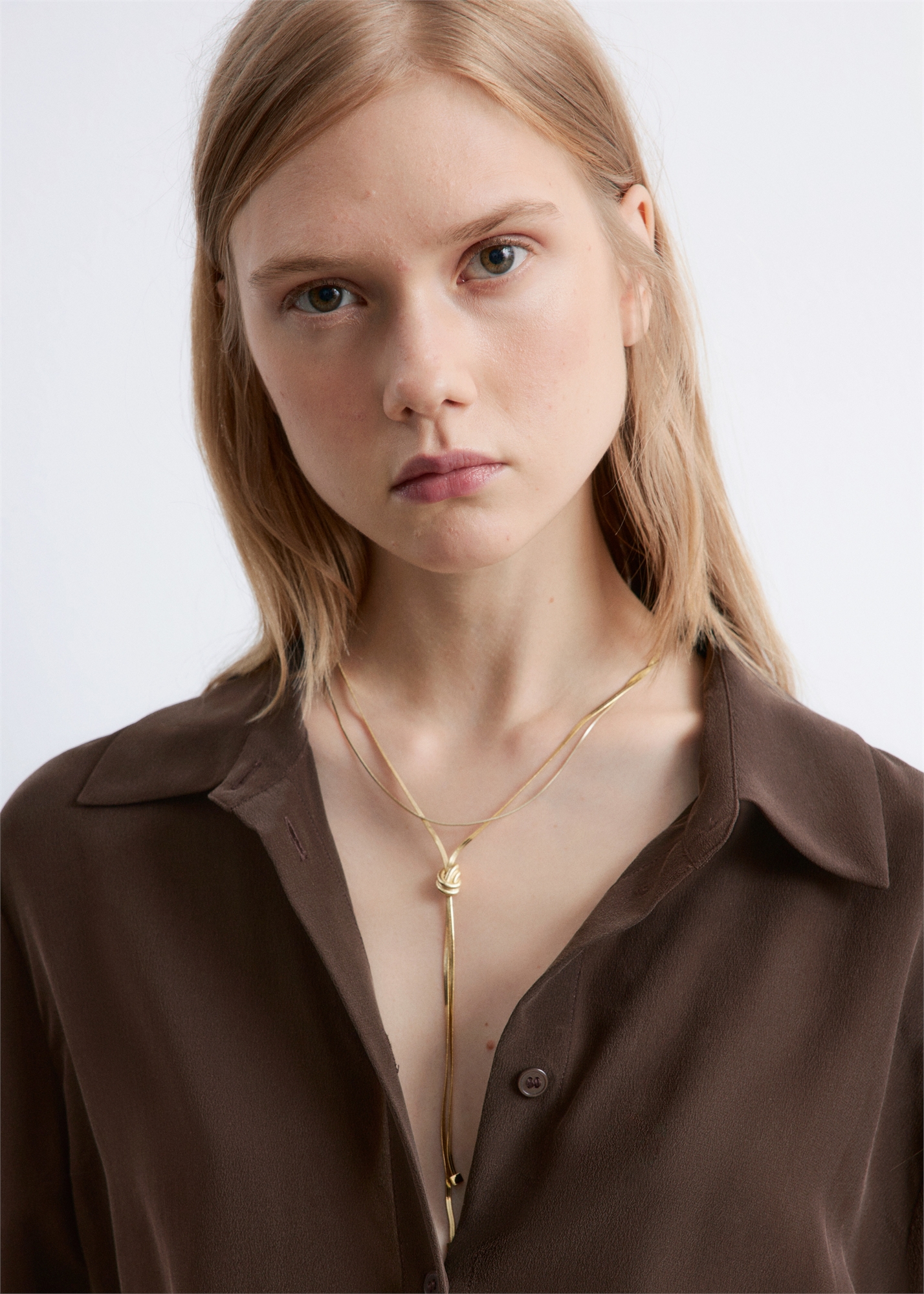 Это Y-образное колье из полированной латуни состоит из двух нитей змеиной цепочки - одной простой, более короткой, и одной с узелком и кубовидными концами. Регулируемая длина и застежка-лобстер. Длина короткой цепочки: 41,5 см.